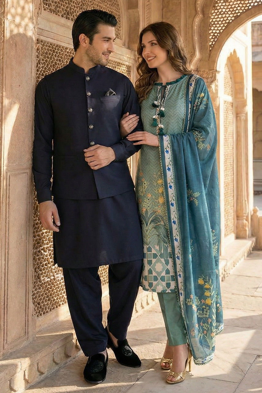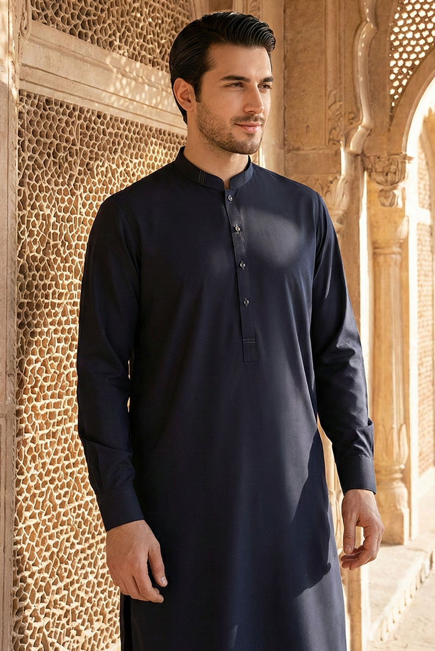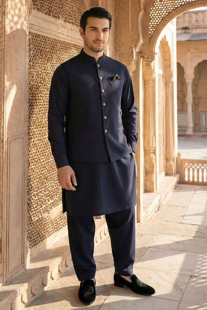 Elevate your traditional wardrobe with this sophisticated Midnight Blue ensemble, designed for the modern gentleman. The kurta and shalwar are expertly crafted from premium Boski Linen, offering a soft, breathable feel with an impeccable drape that ensures comfort throughout the day. The deep, rich blue hue adds an air of regality, perfect for festive occasions and formal gatherings. To complete the look, this set is paired with a structured waistcoat made from high-quality suiting fabric. The waistcoat adds a layer of refined tailoring, creating a sharp silhouette that contrasts beautifully with the fluid elegance of the kurta.