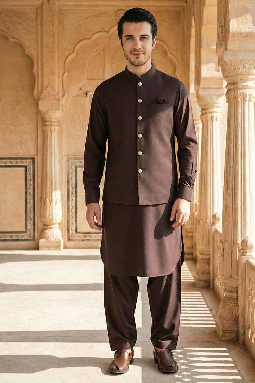 Coffee Brown Boski Linen Kurta Set with Tailored Waistcoat Exude timeless elegance with this rich Coffee Brown ensemble, a perfect blend of tradition and modern tailoring. The kurta and shalwar are cut from premium Boski Linen, ensuring a lightweight, breathable fit with a smooth, luxurious drape. The deep, earthen tone offers a commanding presence, making it a versatile choice for both day and evening events. The look is anchored by a matching waistcoat crafted from high-quality suiting fabric. Featuring a structured fit and accented with distinct metallic buttons, the waistcoat adds a layer of formal sophistication to the relaxed flow of the kurta.