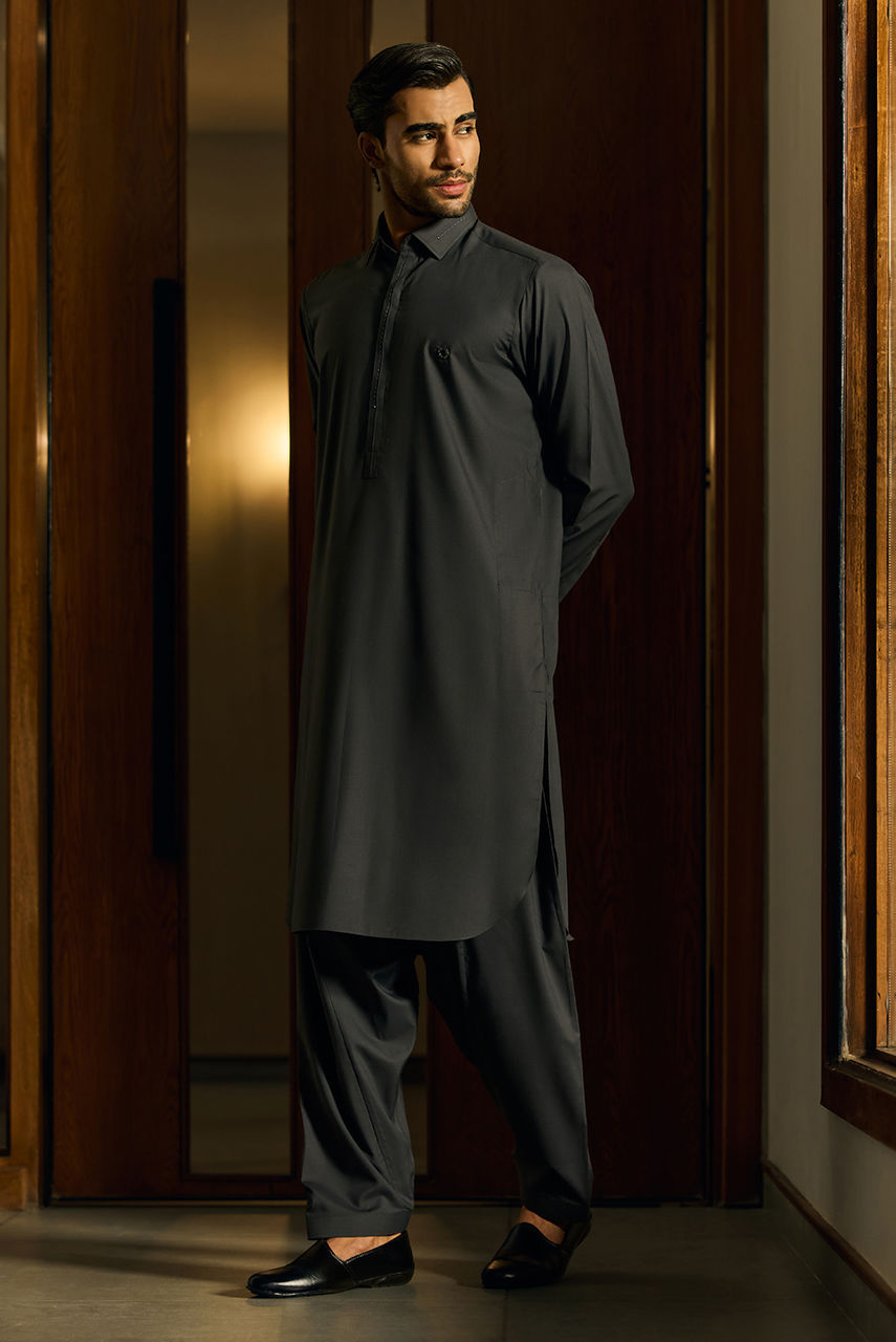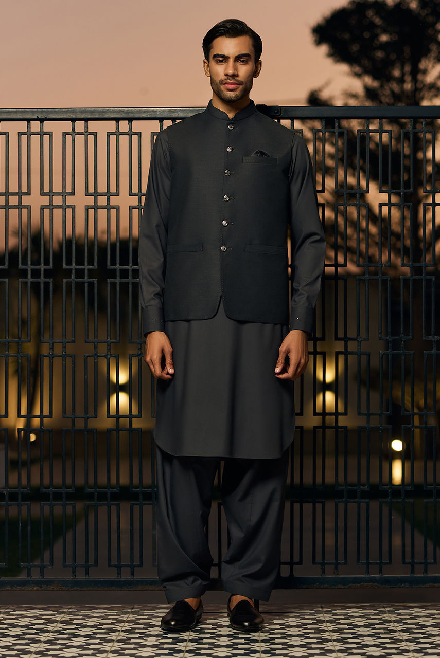 Dark Grey Boski Linen Kurta Set with Tailored Waistcoat Exude timeless elegance with this ensemble, a perfect blend of tradition and modern tailoring. The kurta and shalwar are cut from premium Boski Linen, ensuring a lightweight, breathable fit with a smooth, luxurious drape. The deep, earthen tone offers a commanding presence, making it a versatile choice for both day and evening events. The look is anchored by a matching waistcoat crafted from high-quality suiting fabric. Featuring a structured fit and accented with distinct metallic buttons, the waistcoat adds a layer of formal sophistication to the relaxed flow of the kurta.