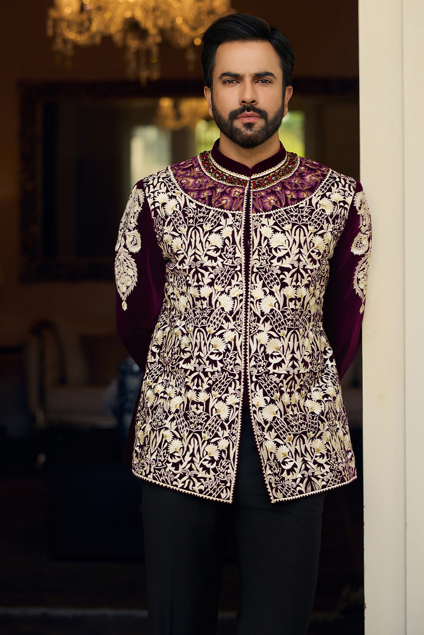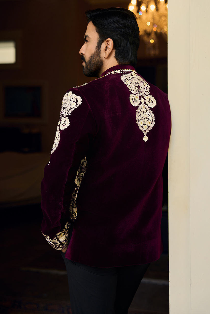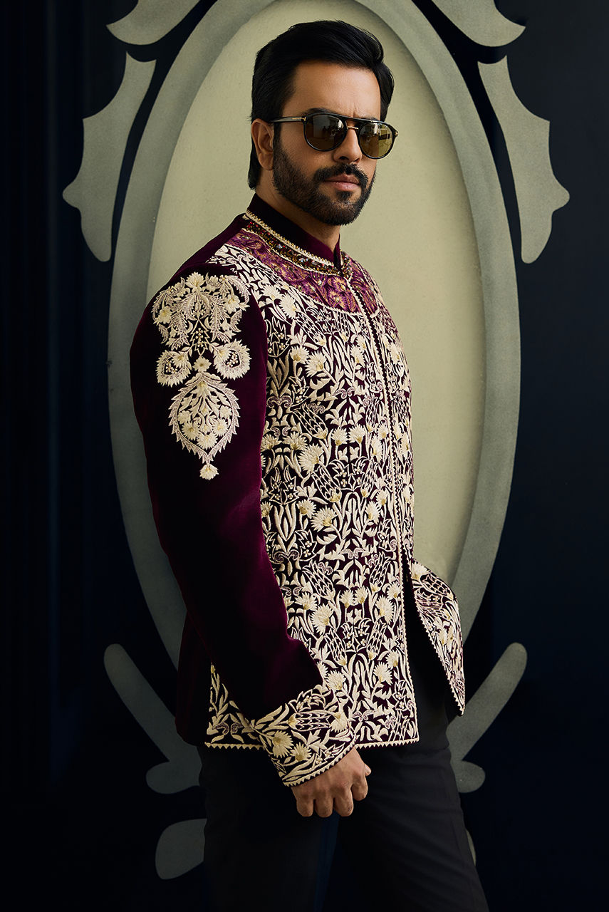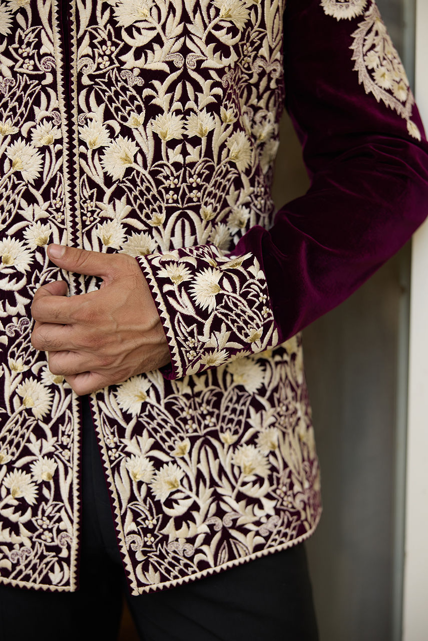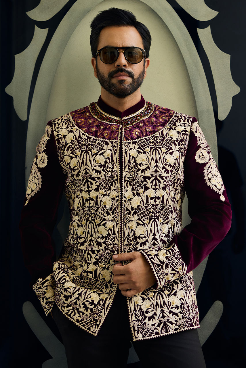Step into sartorial royalty with this opulent Bandhgala jacket. Crafted from deep Maroon Velvet, the jacket features breathtaking, dense Aari and Zardozi work . The intricate, swirling motifs cover the entire front and high jewelled collar, creating a stunning visual contrast that exudes power and tradition. Paired effortlessly with impeccably tailored black dress trousers, this jacket is designed for the modern gentleman who commands the spotlight at weddings, formal dinners, or cultural galas.