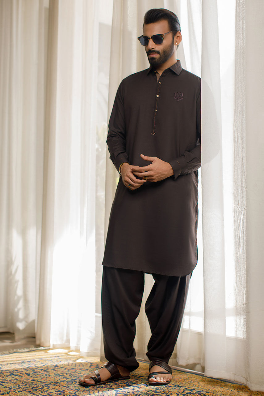 A brown boski linen kurta shalwar with thread work detailing and buttons and an embroidered DP logo.