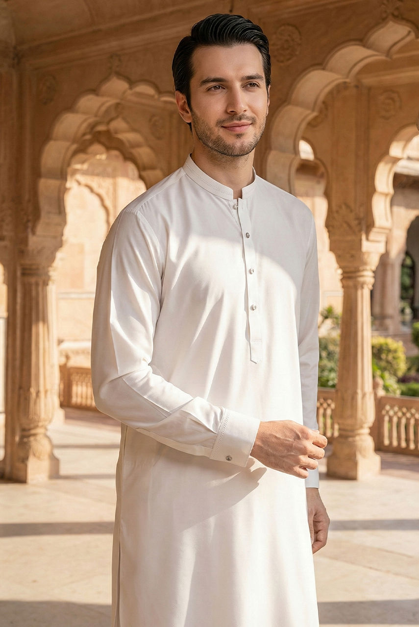 Define understated luxury with this pristine monochromatic ensemble. The foundation of the look is a classic kurta and shalwar crafted from premium Boski linen, known for its fluid drape and soft, cool feel against the skin. It is layered with a structured waistcoat made from high-quality suiting fabric, featuring sharp tailoring, a mandarin collar, and contrasting dark buttons that add a refined focal point. This piece is the epitome of ceremonial elegance, perfect for Eid prayers or formal evening events.