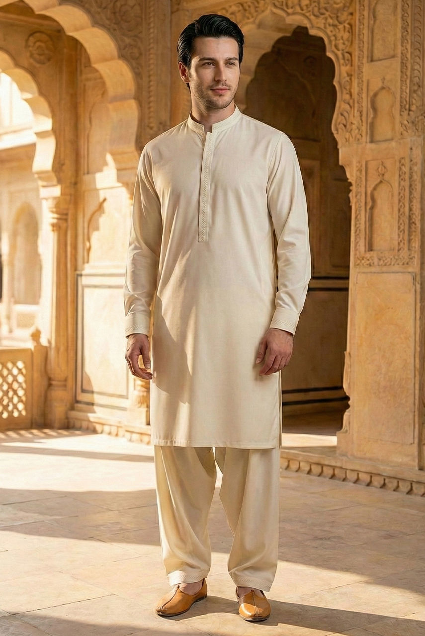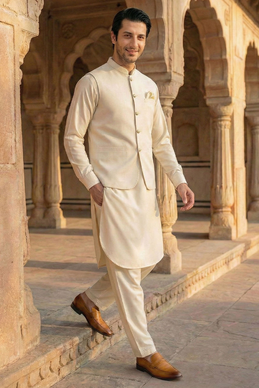 Master the art of tonal dressing with this sophisticated cream ensemble. The base is a classic kurta and shalwar tailored from premium Boski linen, offering a soft, fluid drape and exceptional breathability. It is elevated by a matching waistcoat crafted from fine suiting fabric, providing a structured silhouette that contrasts beautifully with the linen. Finished with antique-finish crafted buttons, this piece set strikes the perfect balance between traditional ease and formal precision.