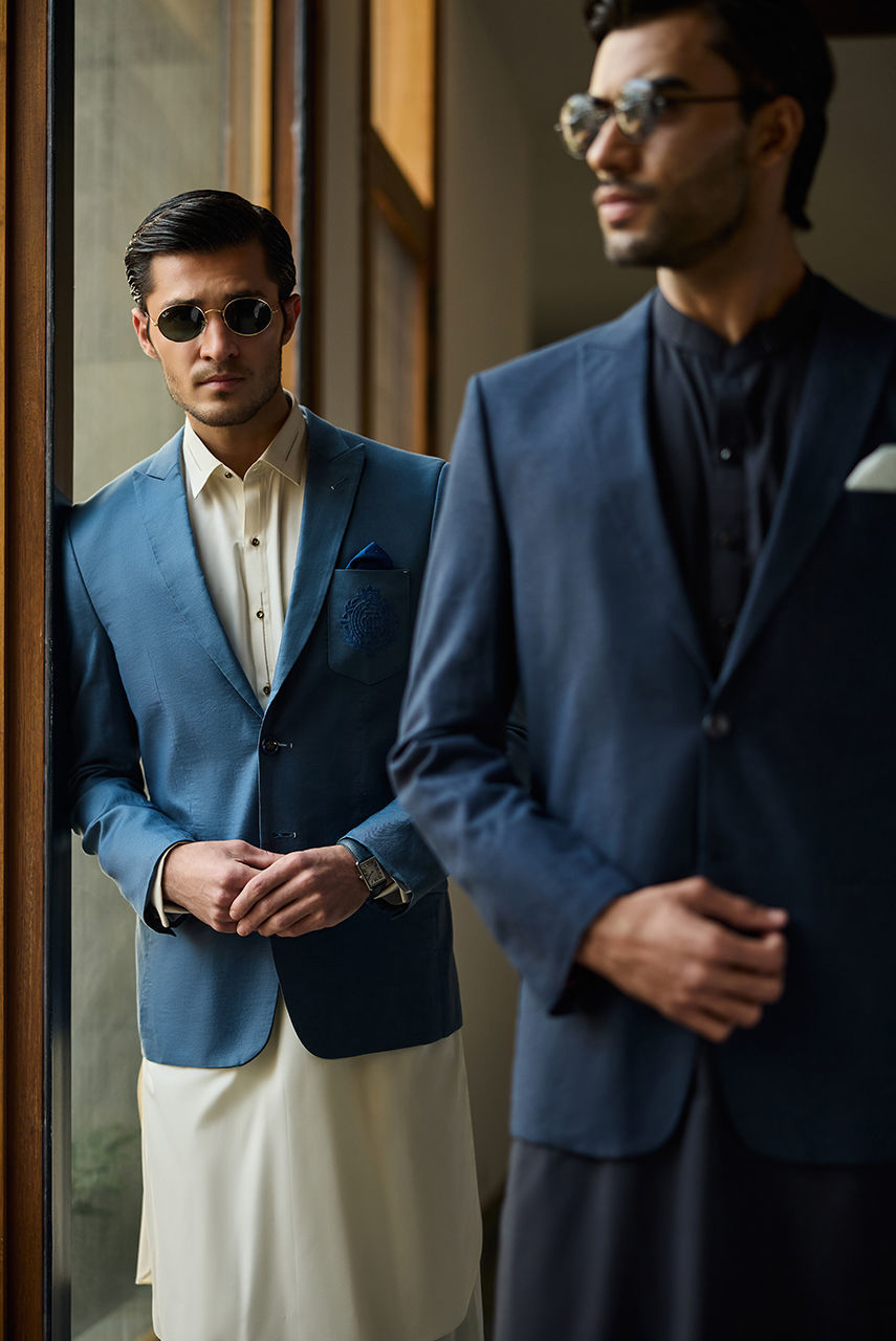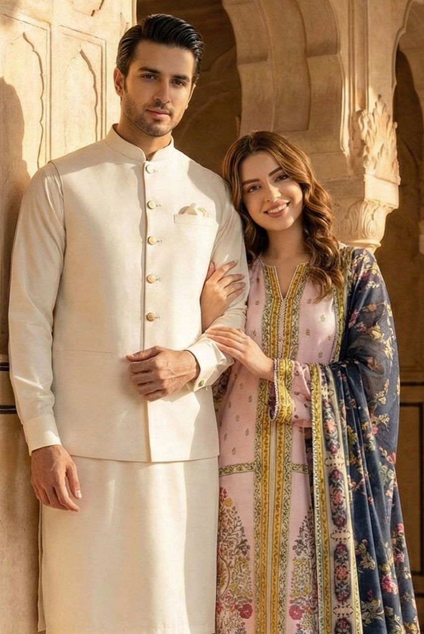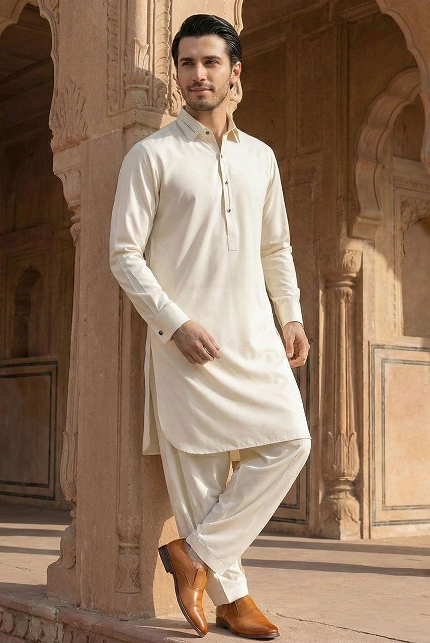 Exude timeless sophistication with this pristine, monochromatic look designed for the modern gentleman. This ensemble pairs a luxuriously soft Boski linen kurta shalwar with a structured suiting fabric waistcoat, creating a subtle interplay of textures in a matching cream hue. The waistcoat features a sharp mandarin collar and is punctuated by distinctive gold-tone metallic buttons that add a touch of regal refinement. Finished with a crisp pocket square, this outfit is the epitome of understated luxury, perfect for festive occasions and formal gatherings.