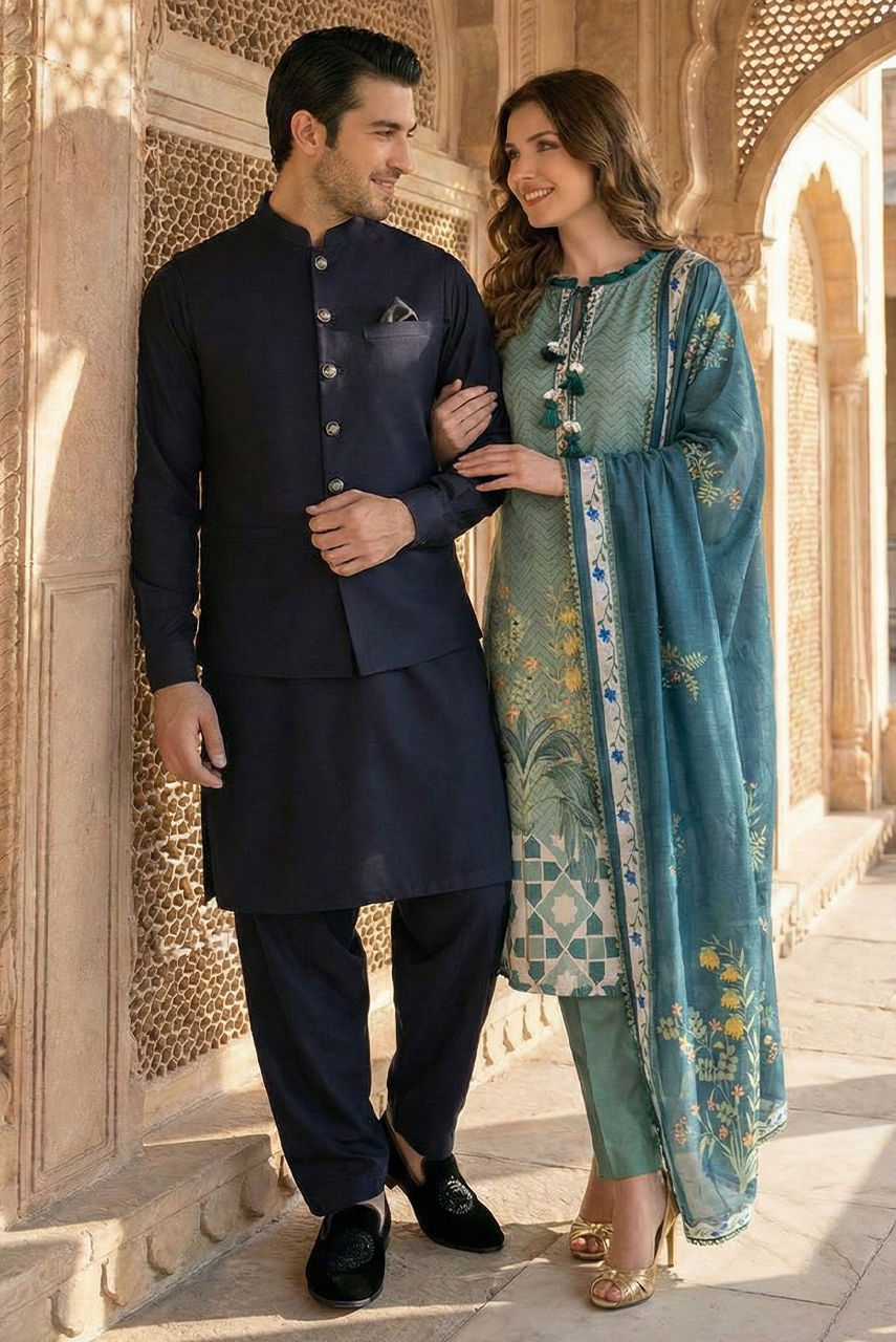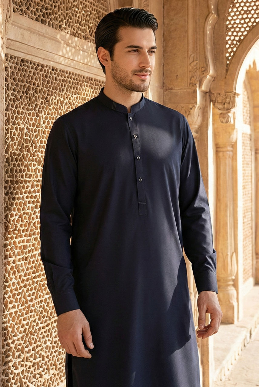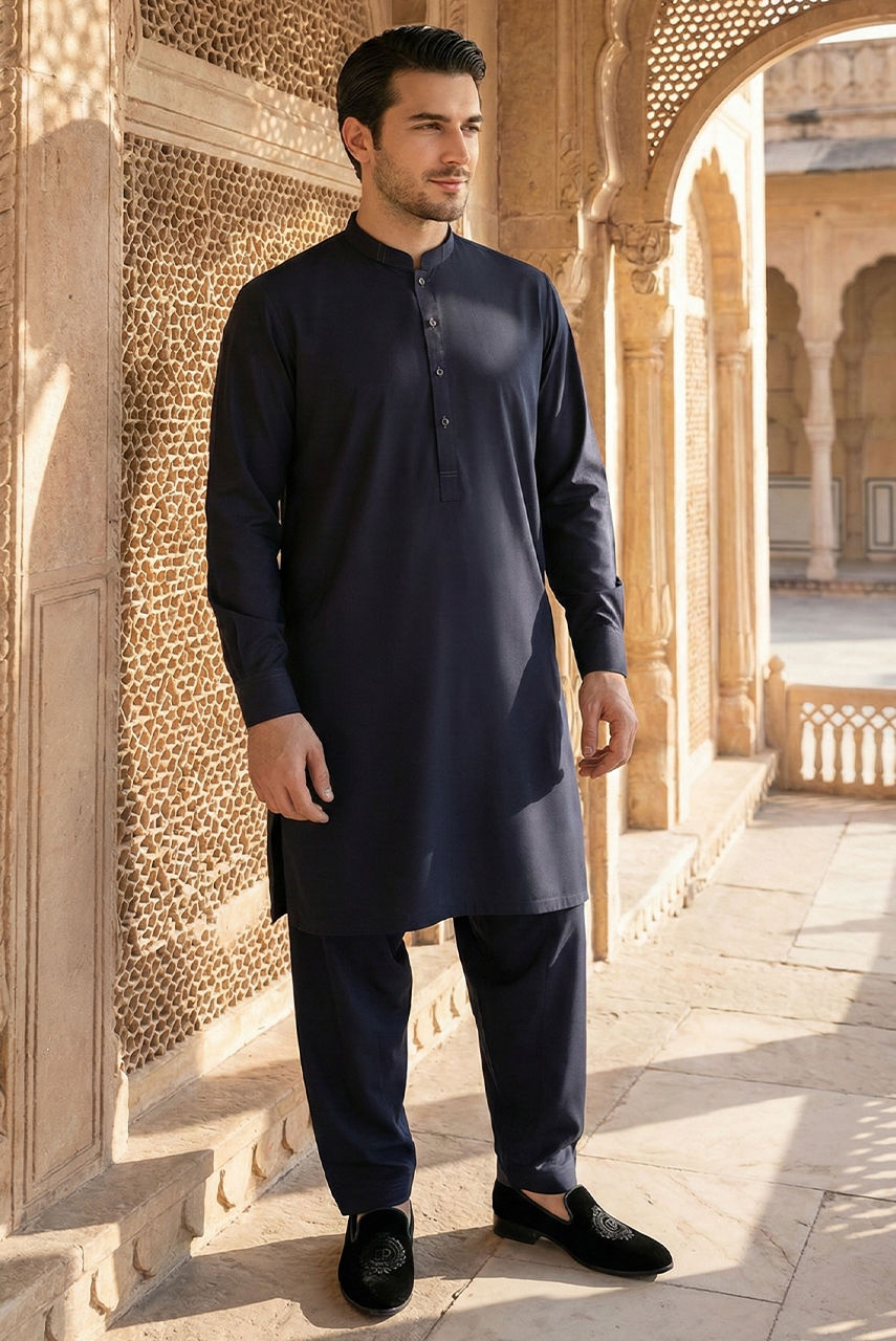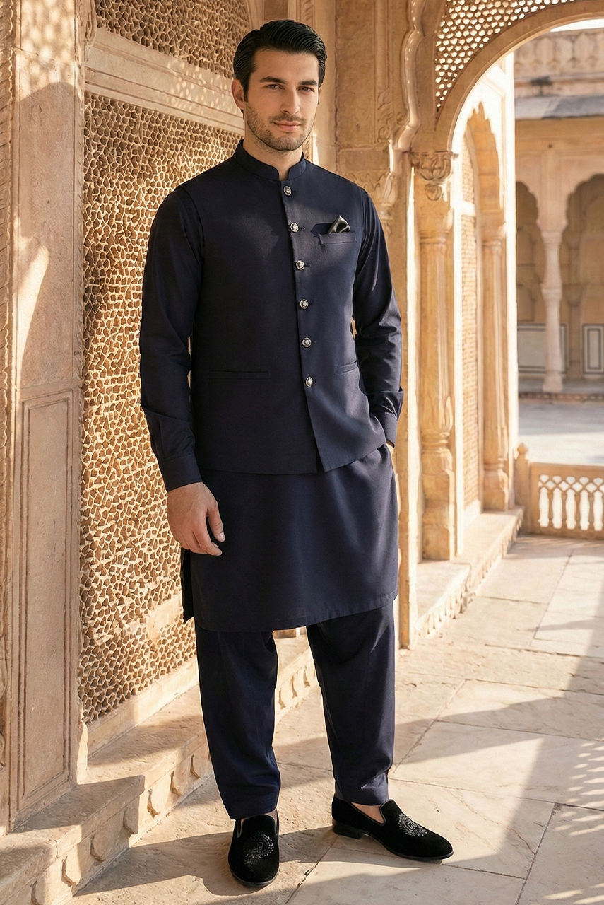 Elevate your traditional wardrobe with this sophisticated Midnight Blue ensemble, designed for the modern gentleman. The kurta and shalwar are expertly crafted from premium Boski Linen, offering a soft, breathable feel with an impeccable drape that ensures comfort throughout the day. The deep, rich blue hue adds an air of regality, perfect for festive occasions and formal gatherings. To complete the look, this set is paired with a structured waistcoat made from high-quality suiting fabric. The waistcoat adds a layer of refined tailoring, creating a sharp silhouette that contrasts beautifully with the fluid elegance of the kurta.