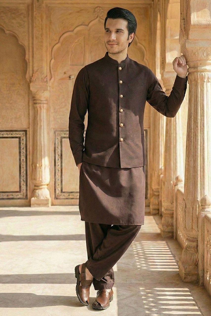 Coffee Brown Boski Linen Kurta Set with Tailored Waistcoat Exude timeless elegance with this rich Coffee Brown ensemble, a perfect blend of tradition and modern tailoring. The kurta and shalwar are cut from premium Boski Linen, ensuring a lightweight, breathable fit with a smooth, luxurious drape. The deep, earthen tone offers a commanding presence, making it a versatile choice for both day and evening events. The look is anchored by a matching waistcoat crafted from high-quality suiting fabric. Featuring a structured fit and accented with distinct metallic buttons, the waistcoat adds a layer of formal sophistication to the relaxed flow of the kurta.