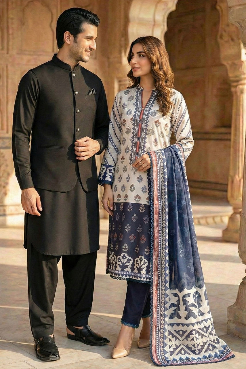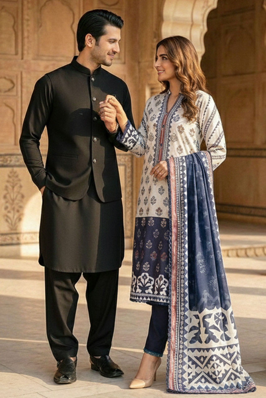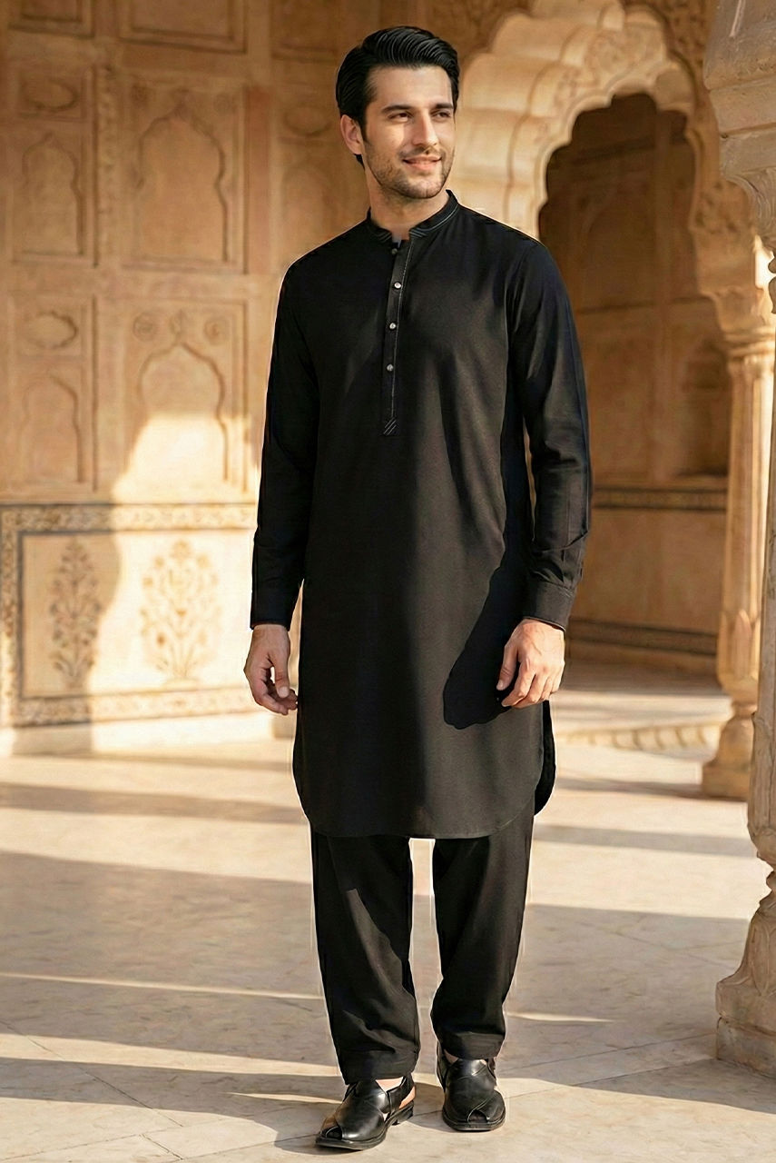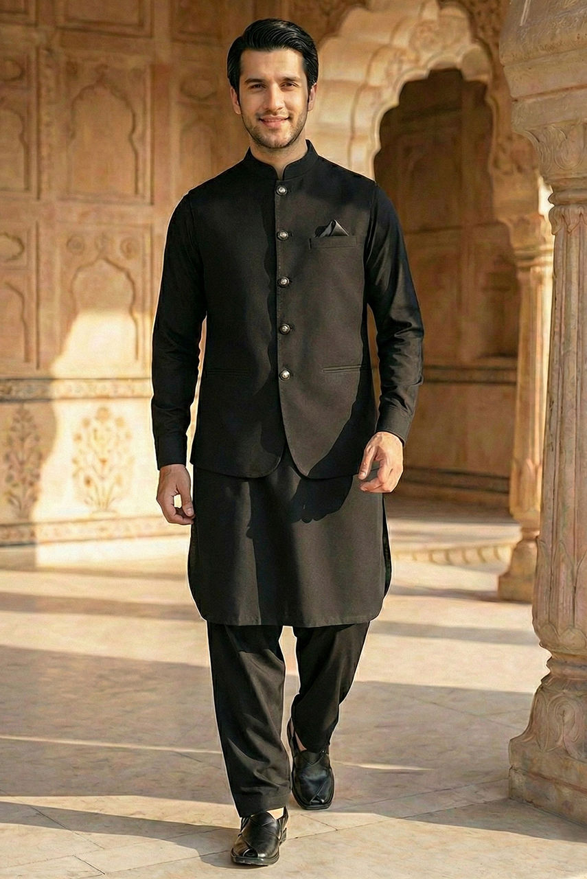 The Midnight Noir Ensemble Exude timeless sophistication with this monotone black ensemble, designed for the modern gentleman who values understated luxury. This set features a meticulously tailored kurta and shalwar crafted from premium Boski Linen, offering a fluid drape and breathable comfort suitable for any season. The look is elevated by a structured waistcoat made from high-quality suiting fabric. Featuring a classic mandarin collar and accented with distinct metallic buttons, the waistcoat adds a layer of refined structure to the silhouette. Perfect for festive occasions and formal gatherings, this outfit strikes the perfect balance between traditional charm and contemporary class.