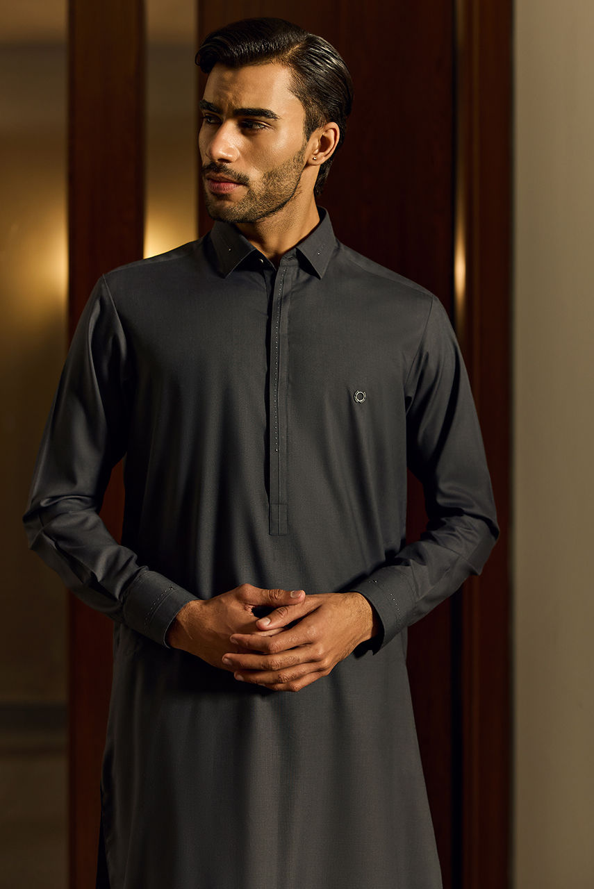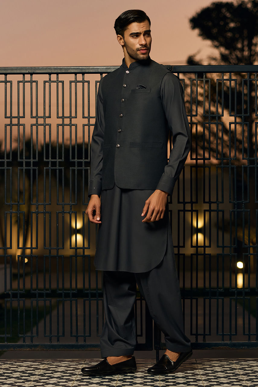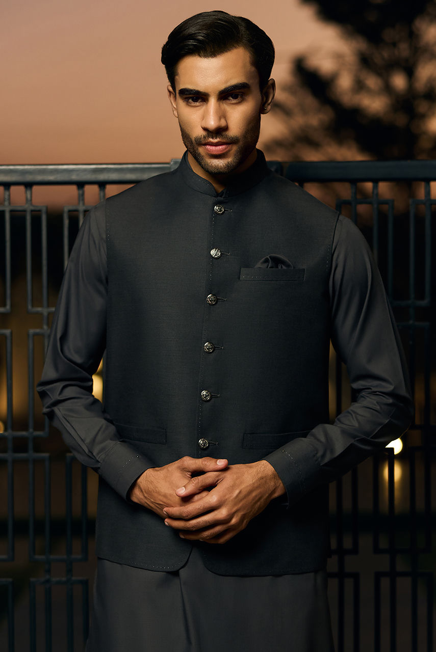 Dark Grey Boski Linen Kurta Set with Tailored Waistcoat Exude timeless elegance with this ensemble, a perfect blend of tradition and modern tailoring. The kurta and shalwar are cut from premium Boski Linen, ensuring a lightweight, breathable fit with a smooth, luxurious drape. The deep, earthen tone offers a commanding presence, making it a versatile choice for both day and evening events. The look is anchored by a matching waistcoat crafted from high-quality suiting fabric. Featuring a structured fit and accented with distinct metallic buttons, the waistcoat adds a layer of formal sophistication to the relaxed flow of the kurta.