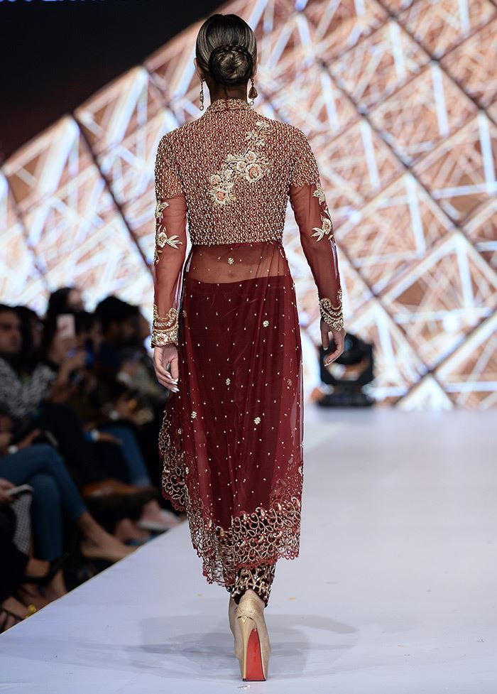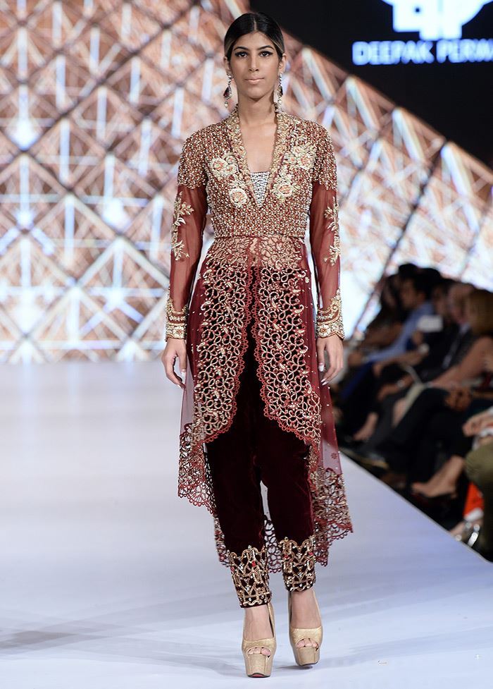 Marroon net peplum with heavy resham, zardozi and cut work paired with heavy hand worked velvet pants.
