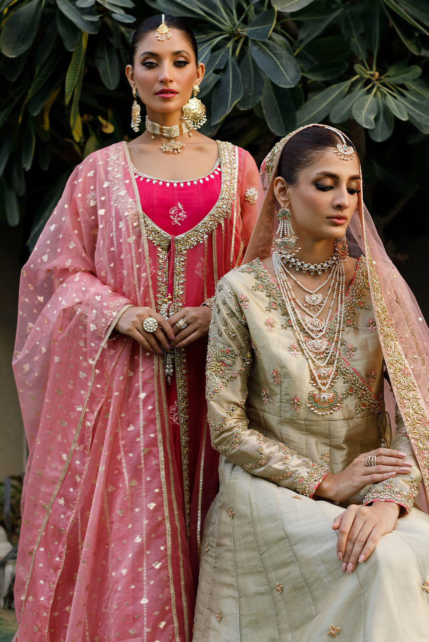 A lamé kalidar with net dupatta and jamavar lehnga. This timeless heritage piece is perfect for a nikkah or an intimate wedding. It is extensively hand worked in Resham, diamonte zardozi pearls and kamdani