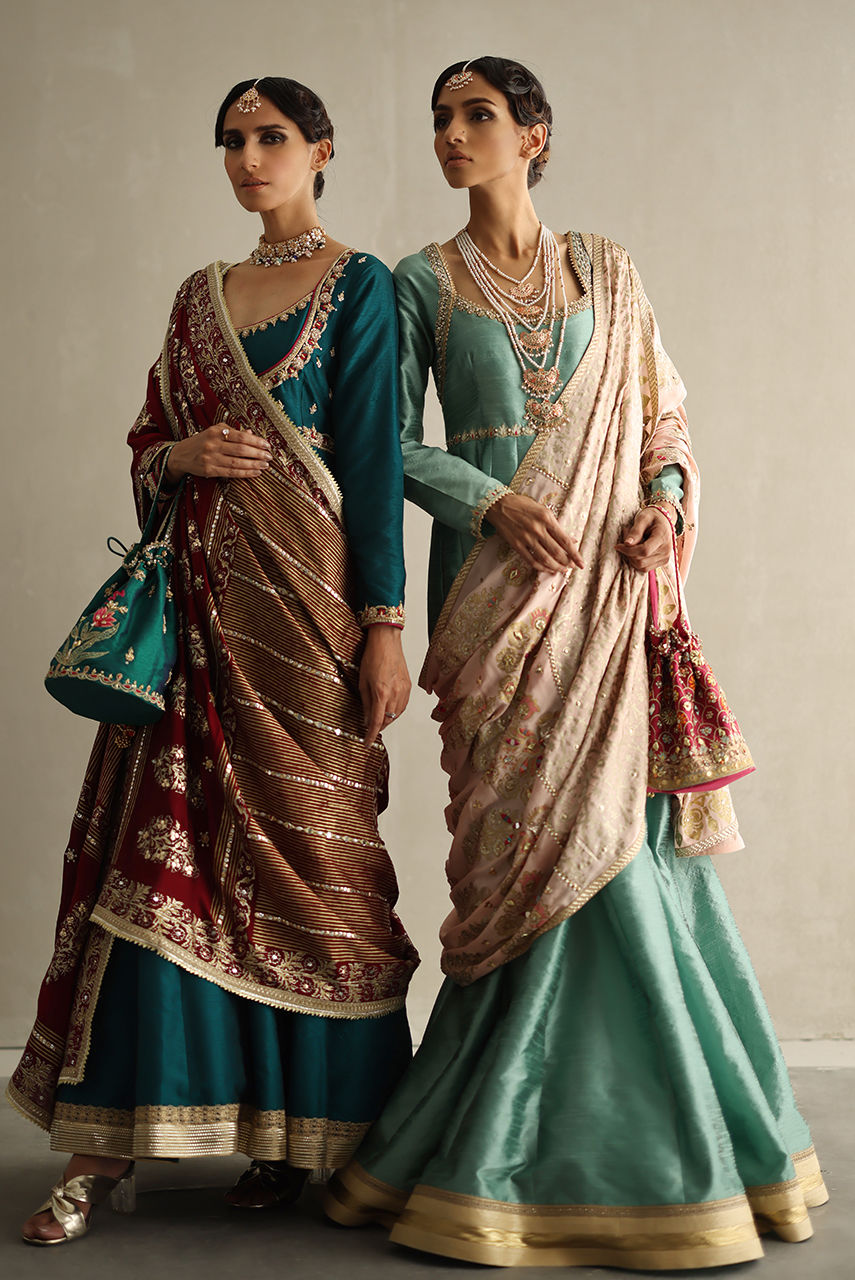 This classic kalidar is cut from khaadi silk and features intricate zardozi and resham work on the neckline and sleeves. It is paired with a silk churidar and crepe shawl featuring extensive hand screen print and hand embroidery. The pouch is hand embroidered in resham and zardozi.