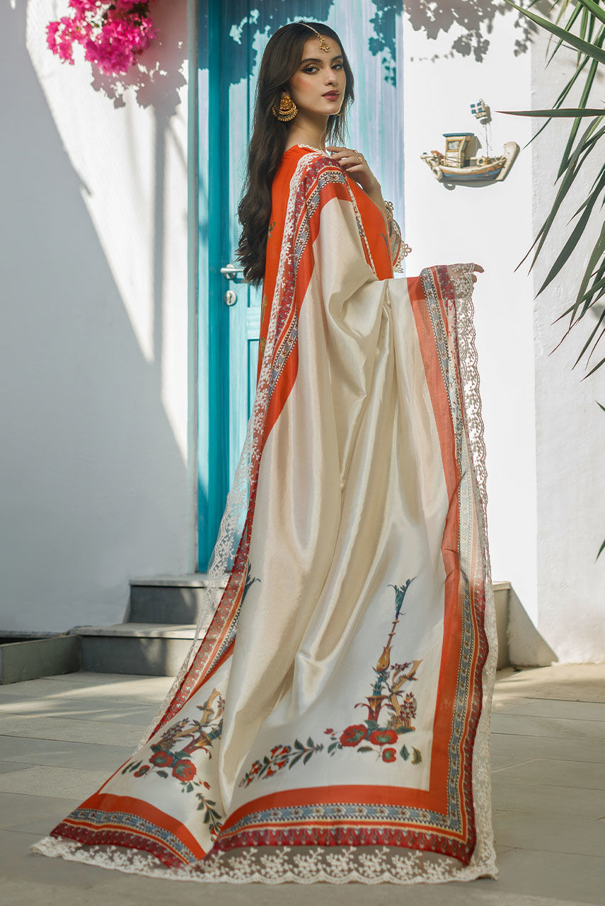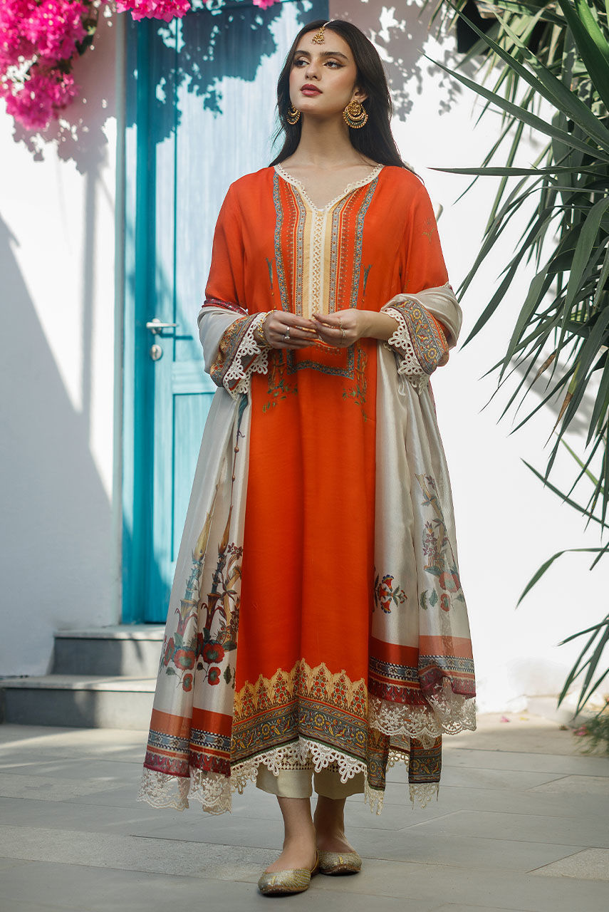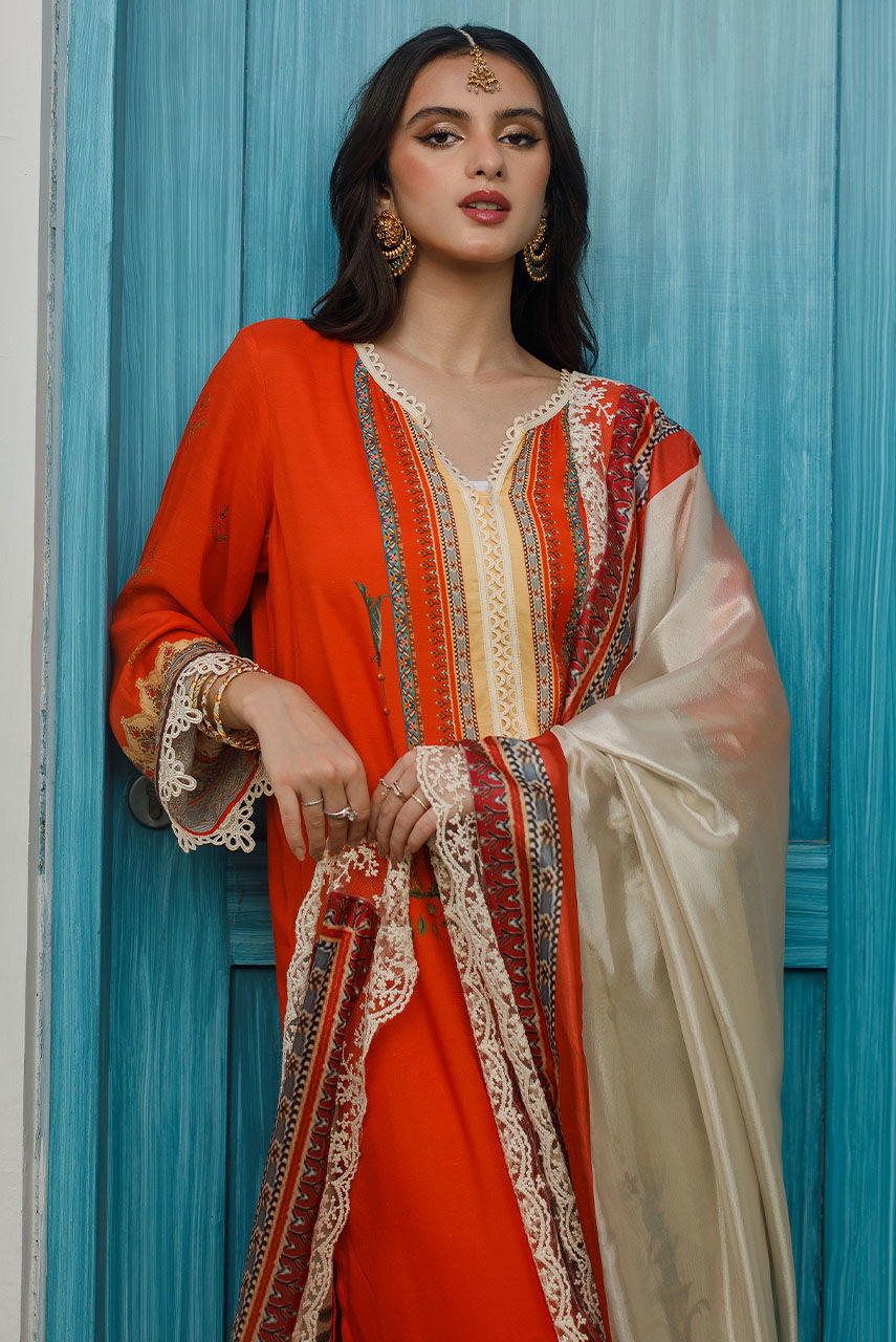 Featuring shades of tangerine, burnt orange, terracotta, and beige gold the ensemble features prints inspired by the baroque floral design. It is a perfect blend of old world meets modern.