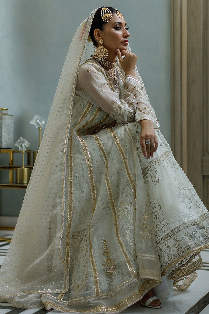 A double layered Anarkali in organza with the inner layer hand block printed extensively. The Anarkali is intricately hand worked in Resham zardozi and gotta work. It is paired with a chorridar and badla boti dupatta.