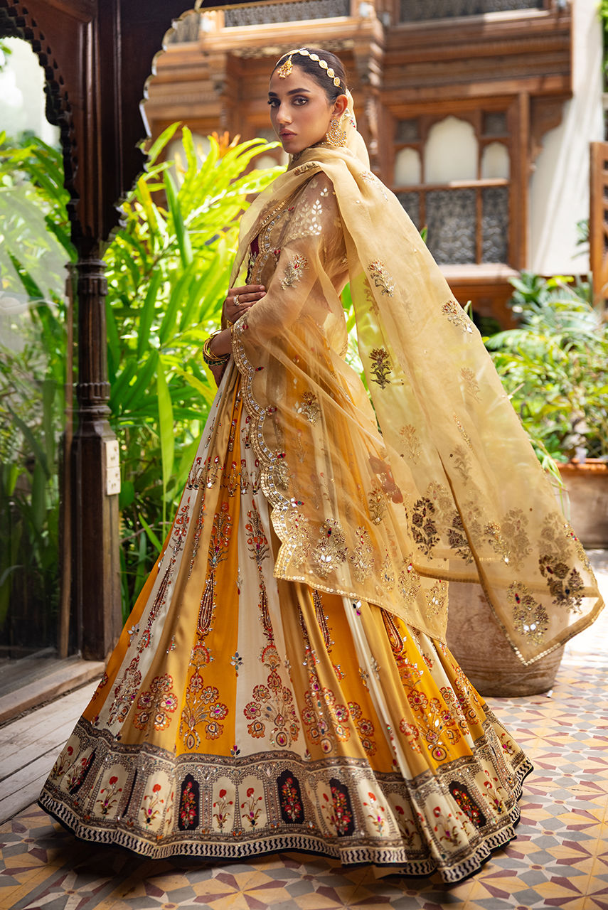 Rendered in our bespoke heritage print this lehnga is crafted in silk with extensive panels which give it the extra flare. It is hand worked in intricate resham, zardozi, gotta, stone and mirror work. The extensively hand worked choli adds to it's charm. The pure organza dupatta is hand block printed and hand worked in intricate resham, zardozi gotta and mirror work