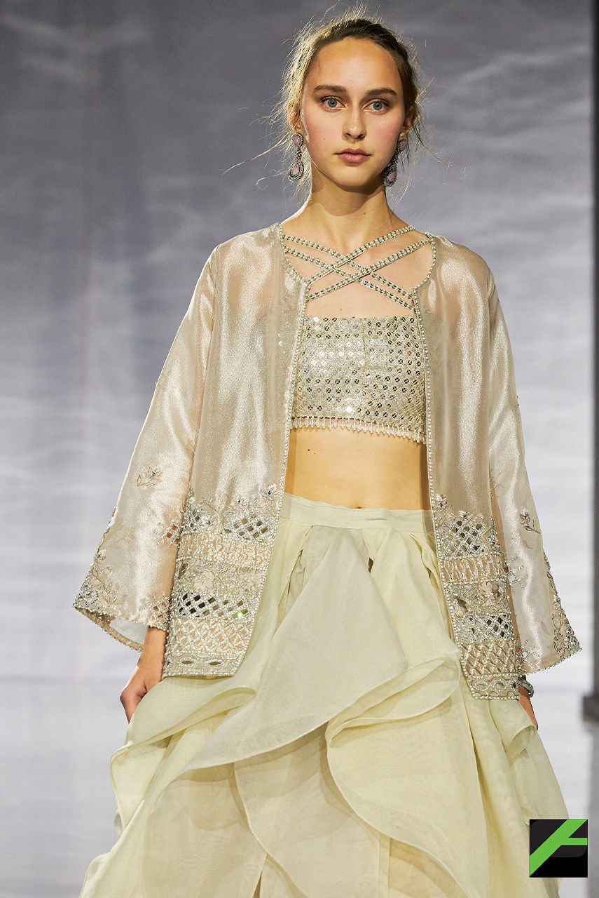 An eggshell grey lama jacket featuring intricate cutwork and handwork detailing, paired with an organza layered petal skirt and a silver sequin tube top for an elegant, contemporary look.