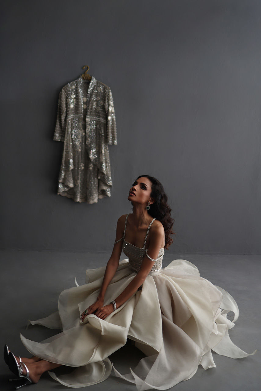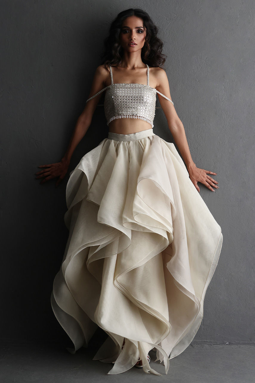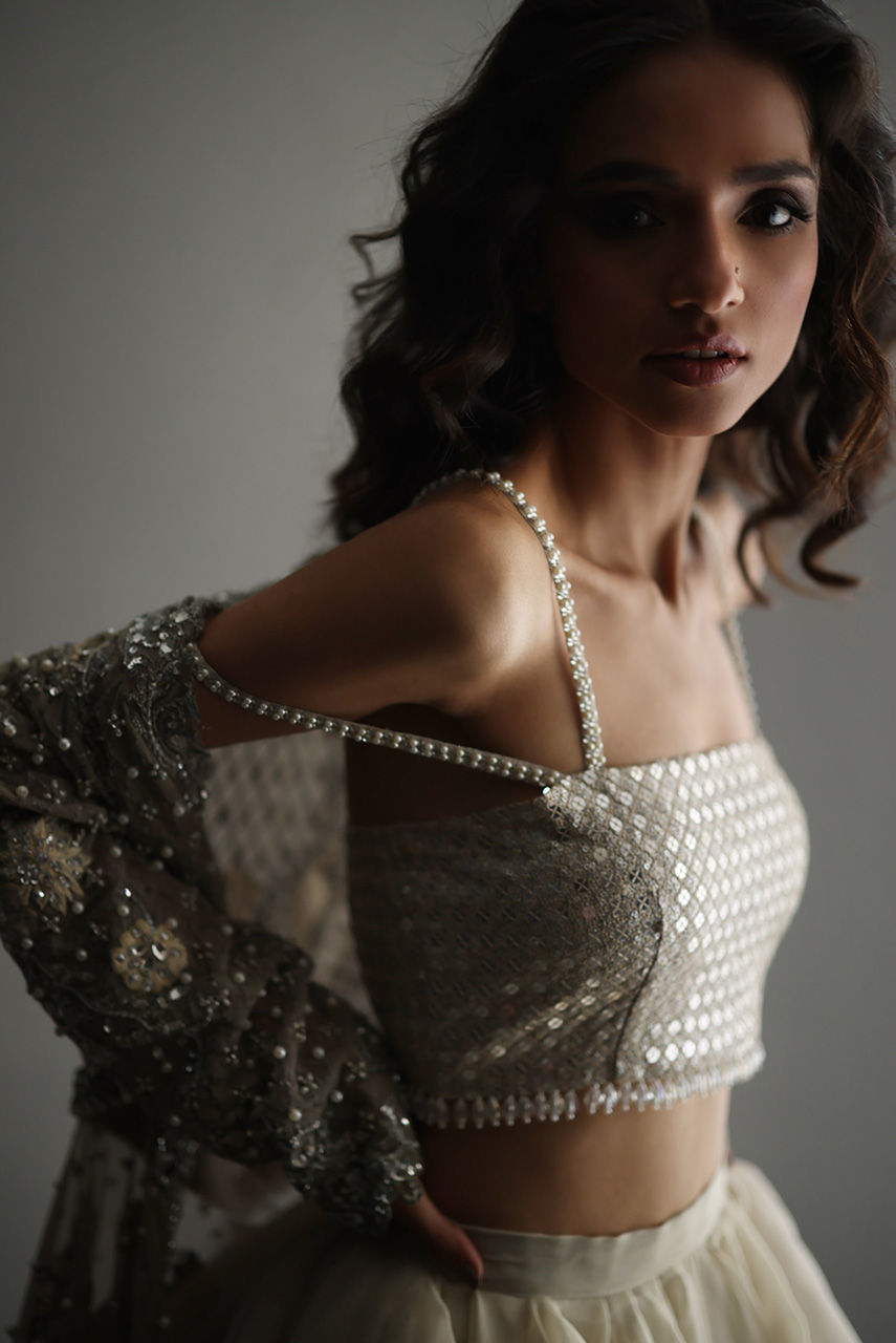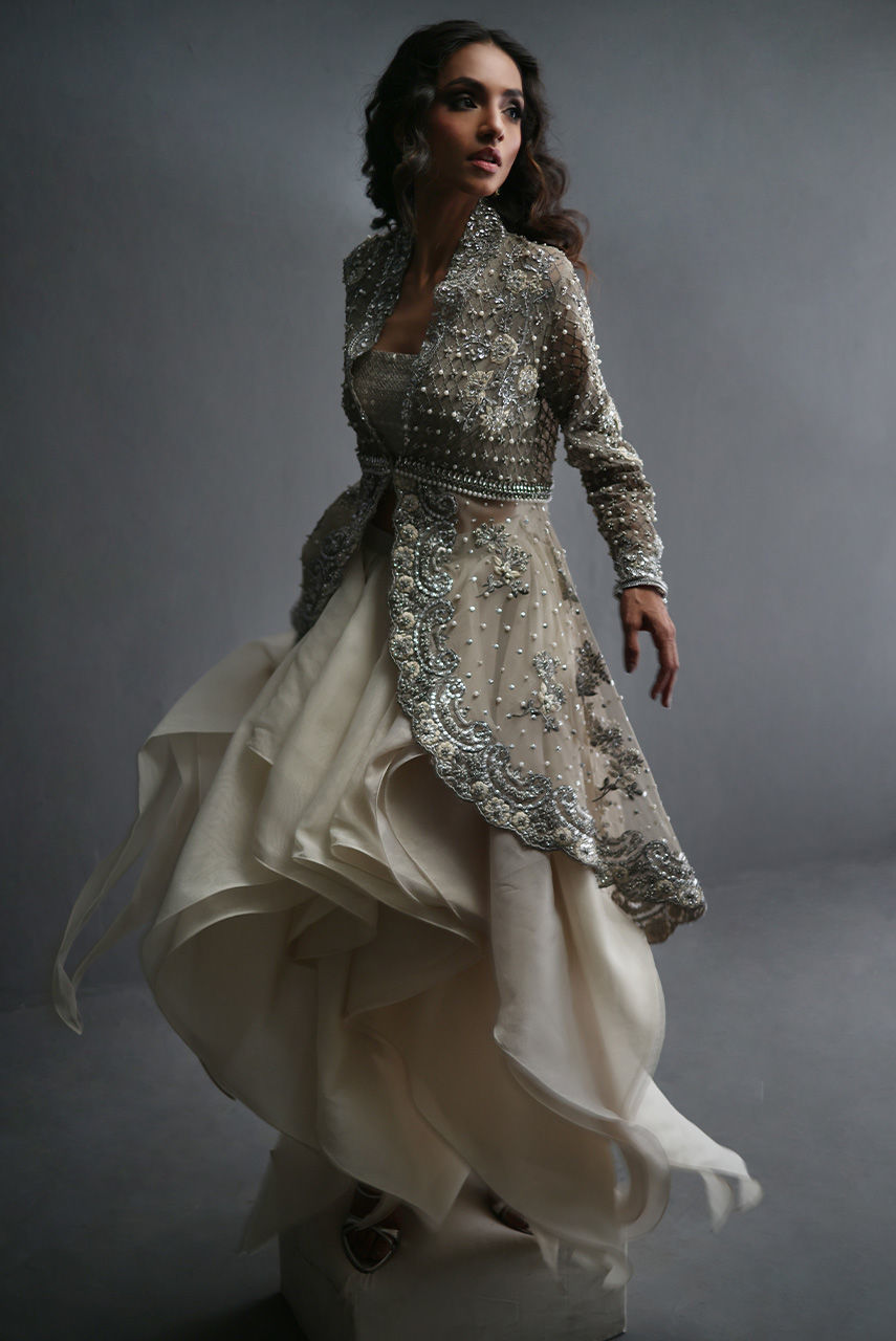 This exquisite silverish grey ensemble features a French net jacket with a cutwork collar and hem, intricately embroidered with Resham and zari thread, and adorned with pearls, diamontes, and sequins. It is layered over a sequin tube top with pearl and diamonte straps, finished with crystal bead detailing on the hem. The look is completed with a voluminous petal-ruffle organza skirt, adding a graceful, diaphanous flow.