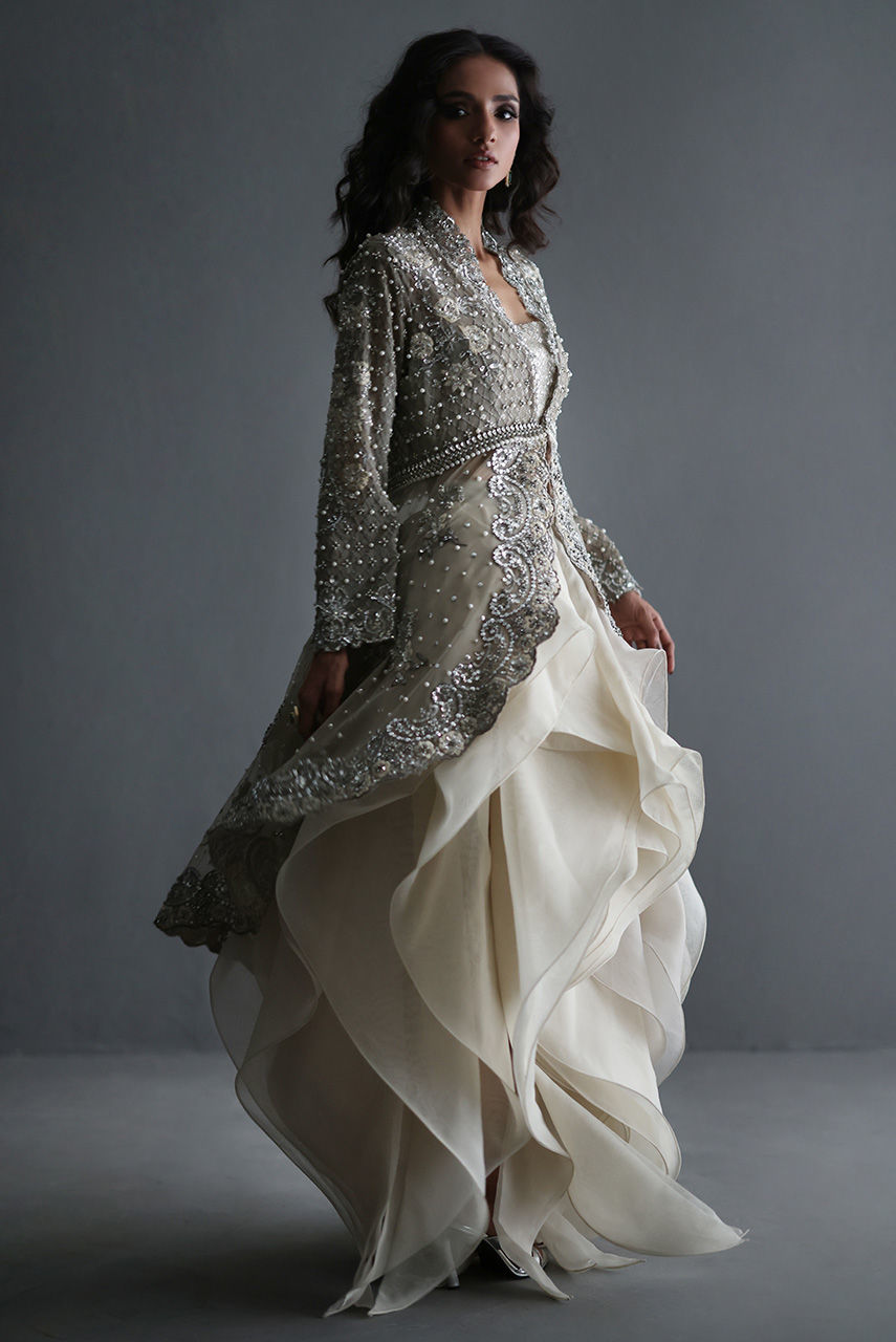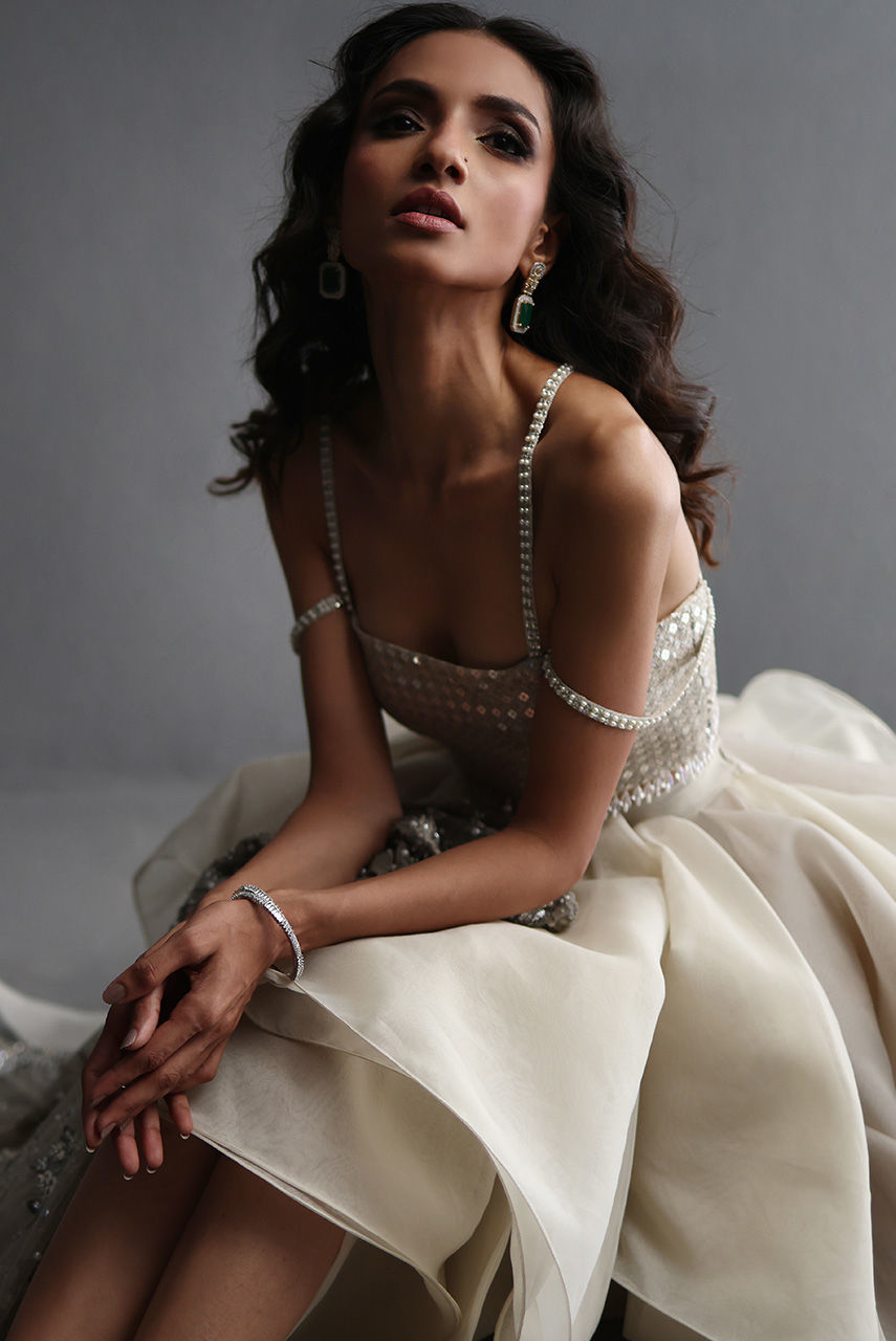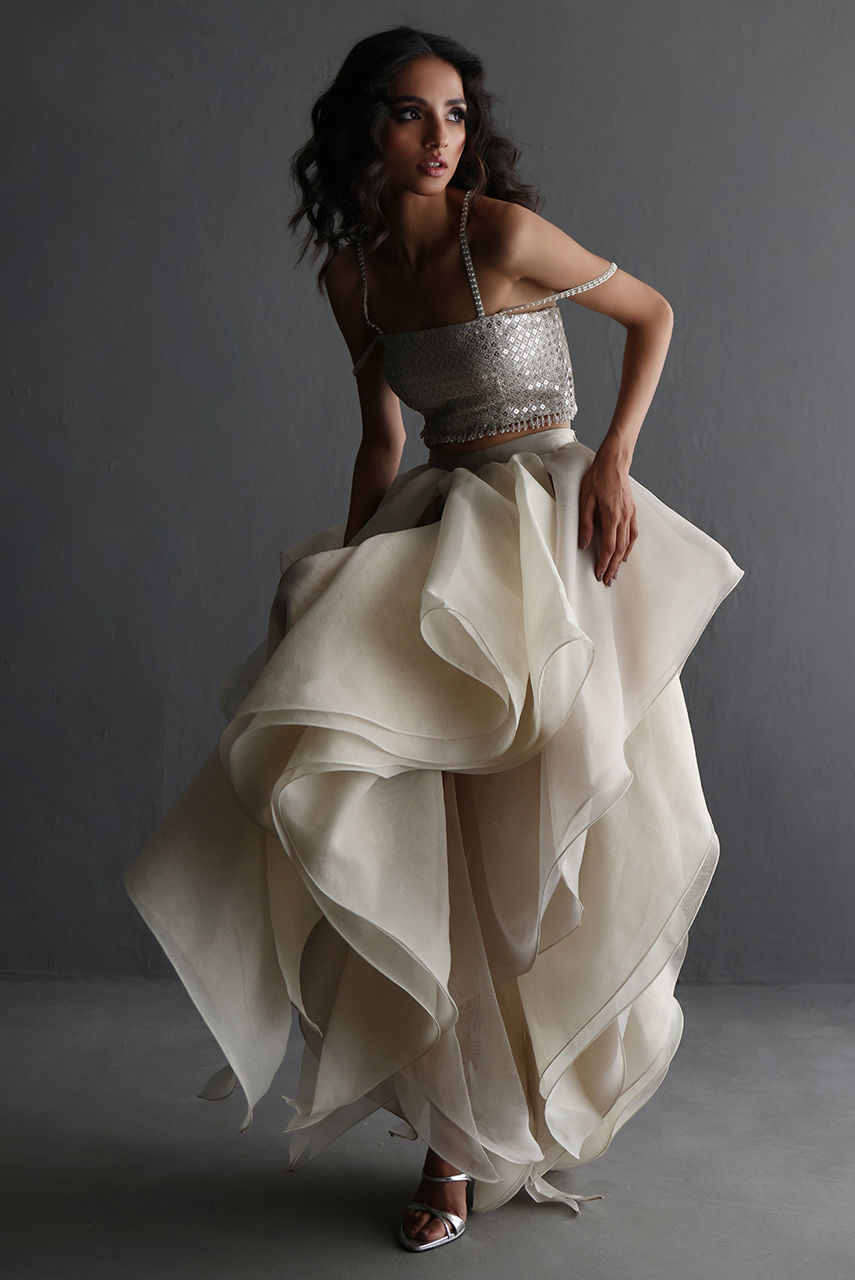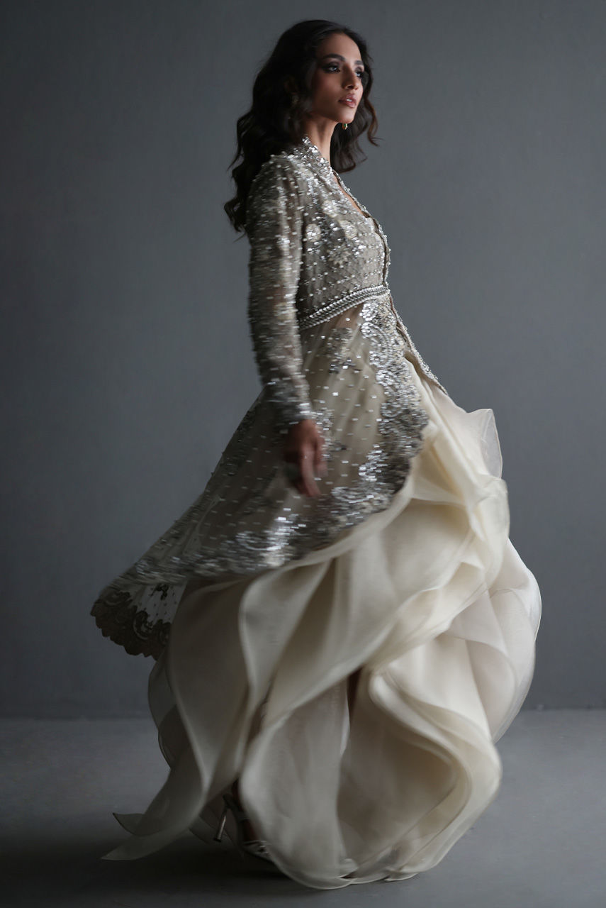 This exquisite silverish grey ensemble features a French net jacket with a cutwork collar and hem, intricately embroidered with Resham and zari thread, and adorned with pearls, diamontes, and sequins. It is layered over a sequin tube top with pearl and diamonte straps, finished with crystal bead detailing on the hem. The look is completed with a voluminous petal-ruffle organza skirt, adding a graceful, diaphanous flow.