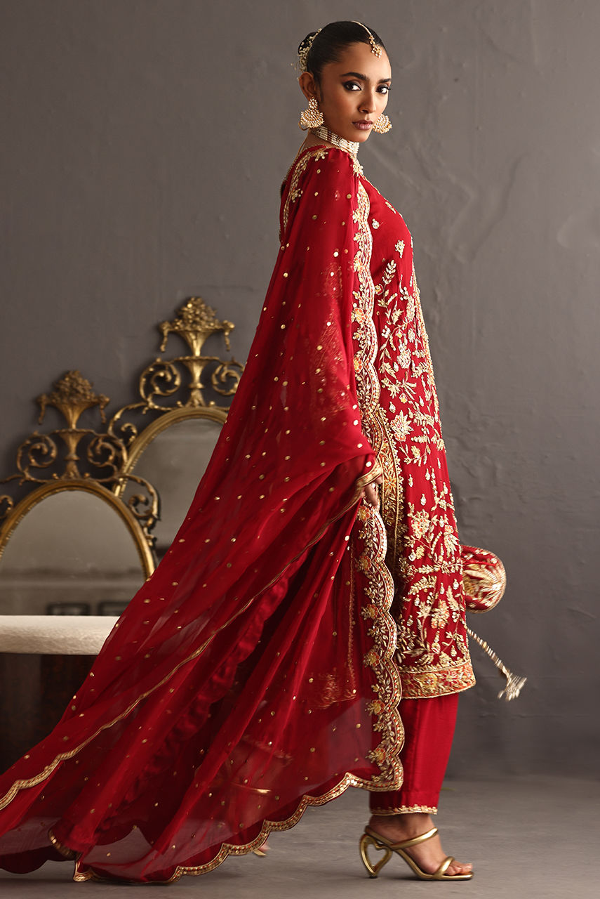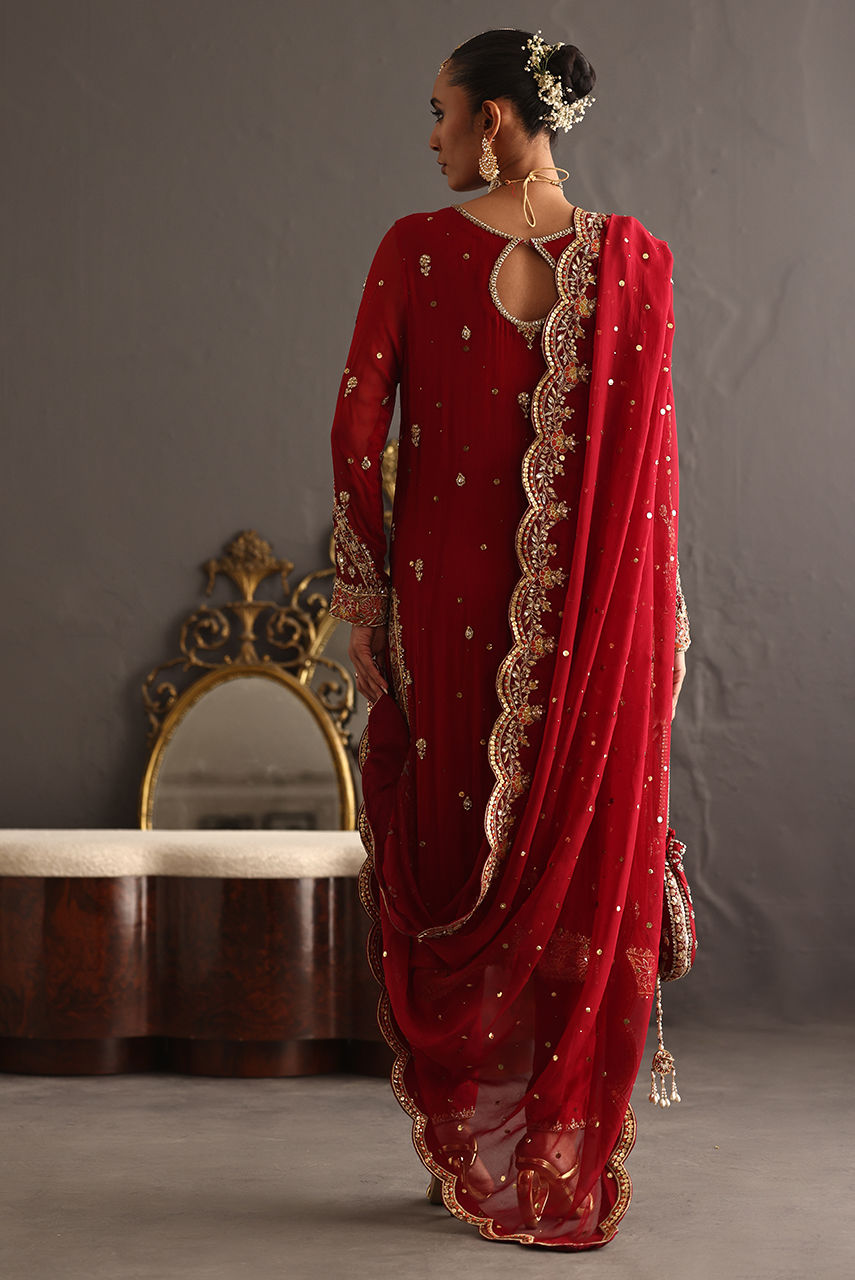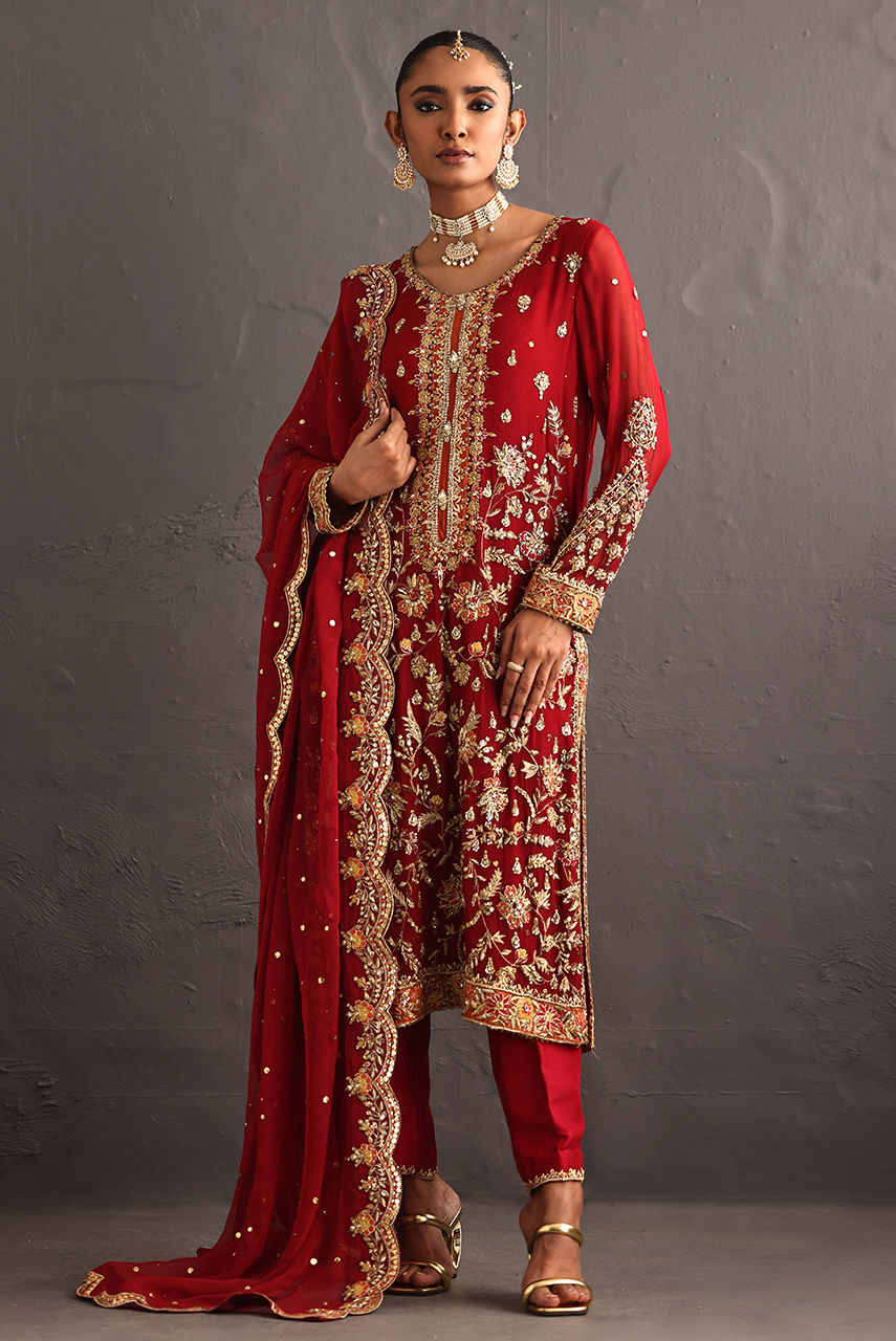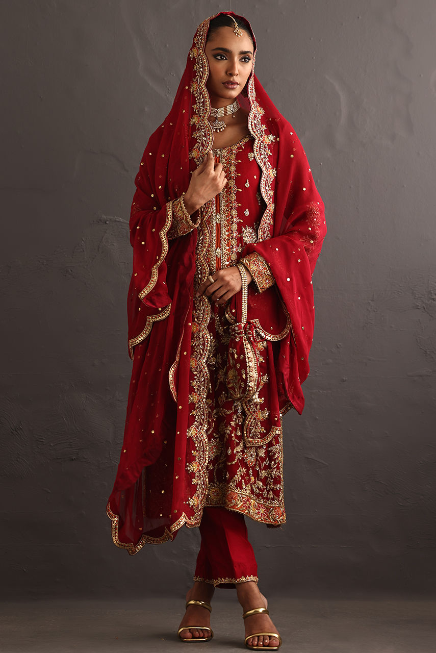 This piece celebrates the poetry of opulence and heritage, rendered in a deep red base that symbolizes festivity and grace. The surface is richly hand-embroidered with zardozi, resham, crystals and kamdani, creating a tapestry of intricate floral vines and ornamental borders reminiscent of mughal jewelry craftsmanship. The shirt and dupatta are crafted from kamdani chiffon and the outfit comes with a pure raw silk pants.
