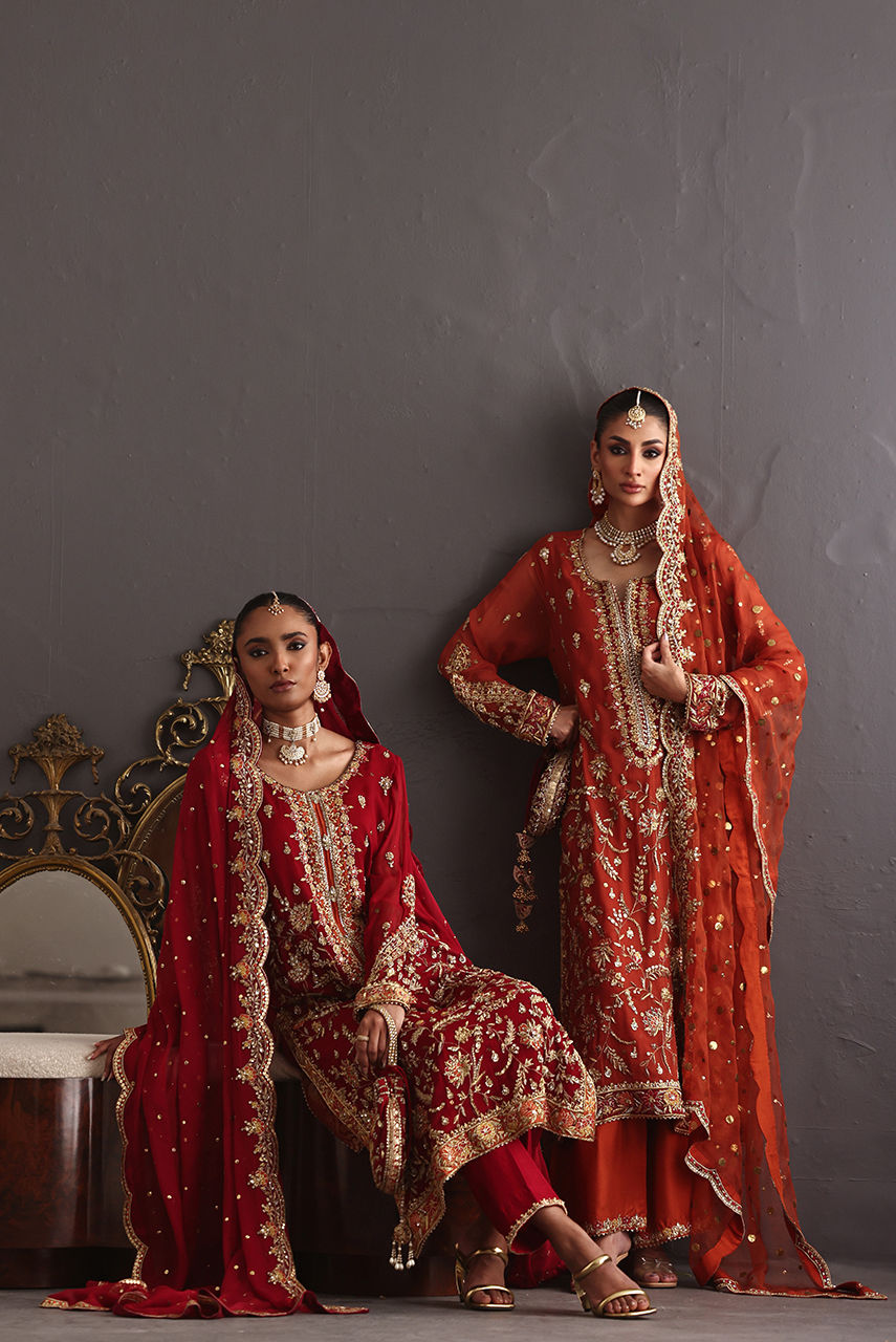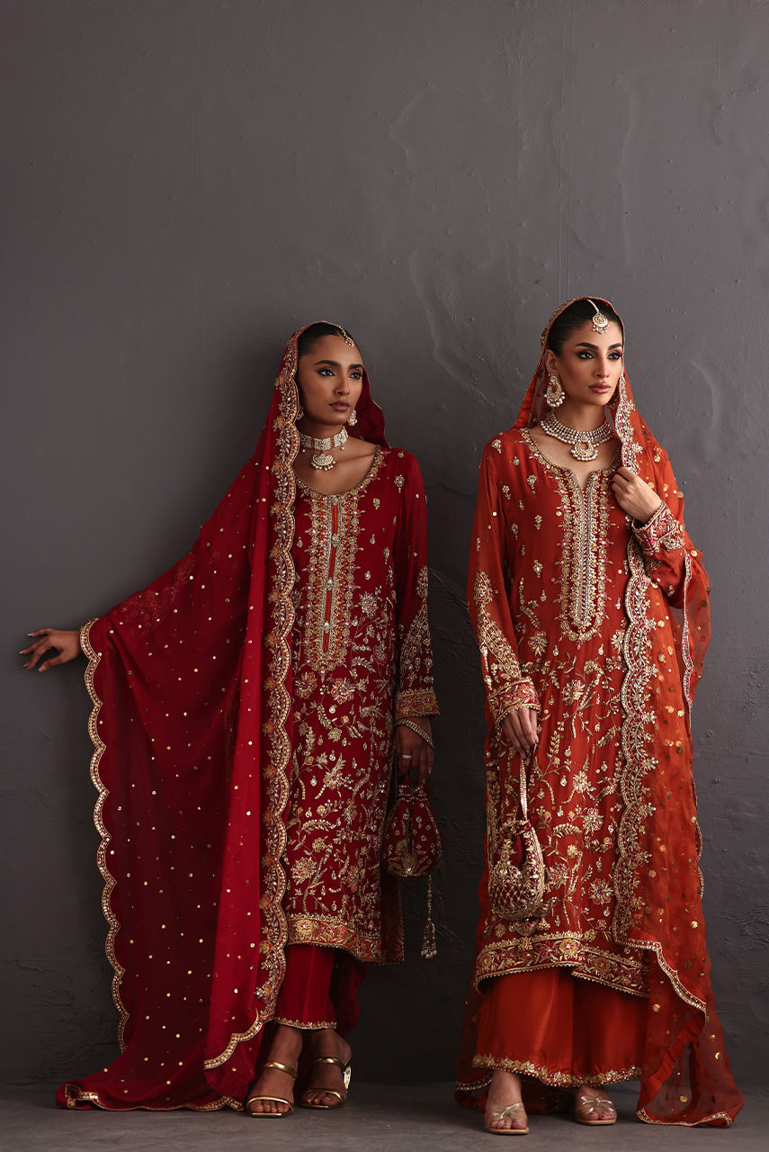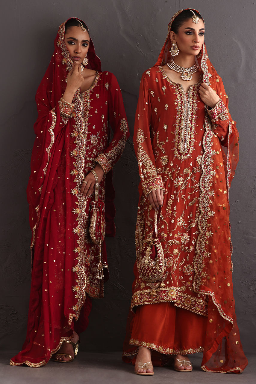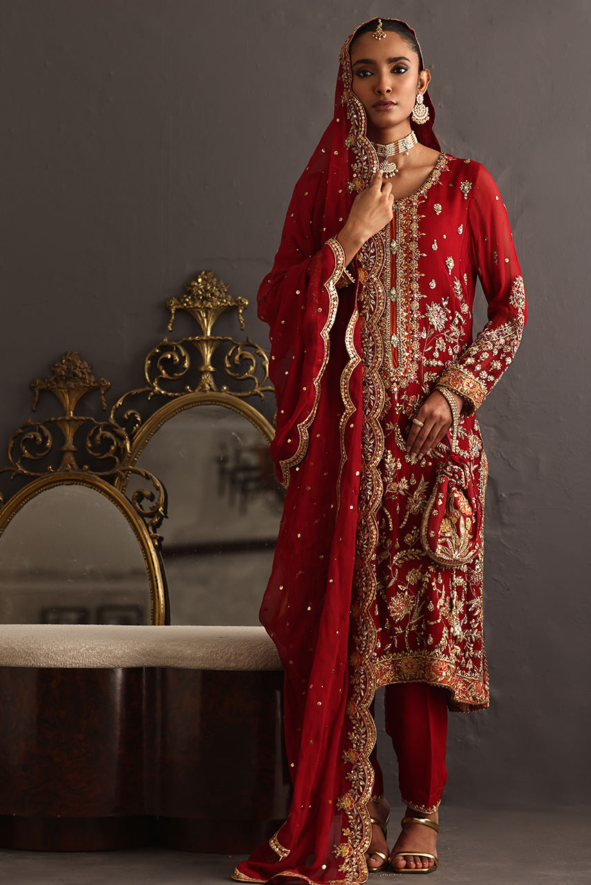 This piece celebrates the poetry of opulence and heritage, rendered in a deep red base that symbolizes festivity and grace. The surface is richly hand-embroidered with zardozi, resham, crystals and kamdani, creating a tapestry of intricate floral vines and ornamental borders reminiscent of mughal jewelry craftsmanship. The shirt and dupatta are crafted from kamdani chiffon and the outfit comes with a pure raw silk pants.
