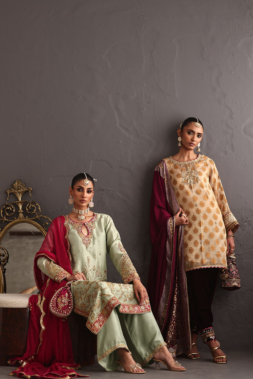This piece celebrates the poetry of opulence and heritage, rendered in a misty jade symbolizes festivity and grace. The surface is richly hand-embroidered with zardozi, resham, crystals and kamdani, creating a tapestry of intricate floral vines and ornamental borders reminiscent of mughal jewelry craftsmanship. The shirt and dupatta are crafted from kamdani chiffon and the outfit comes with a pure raw silk izaar with zardozi.
