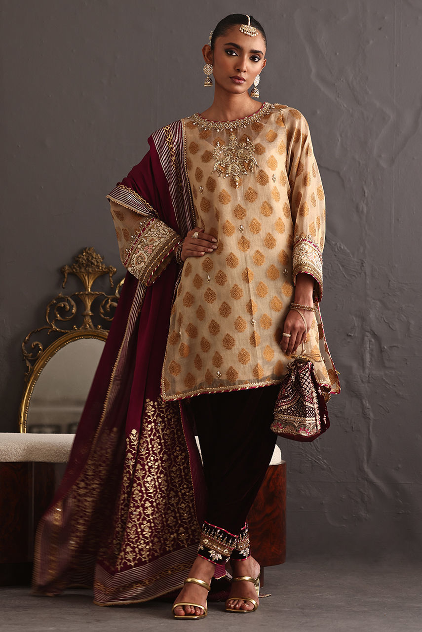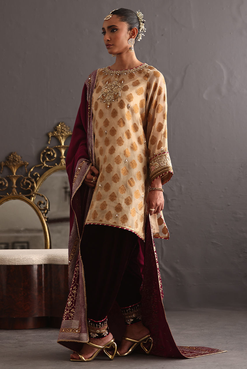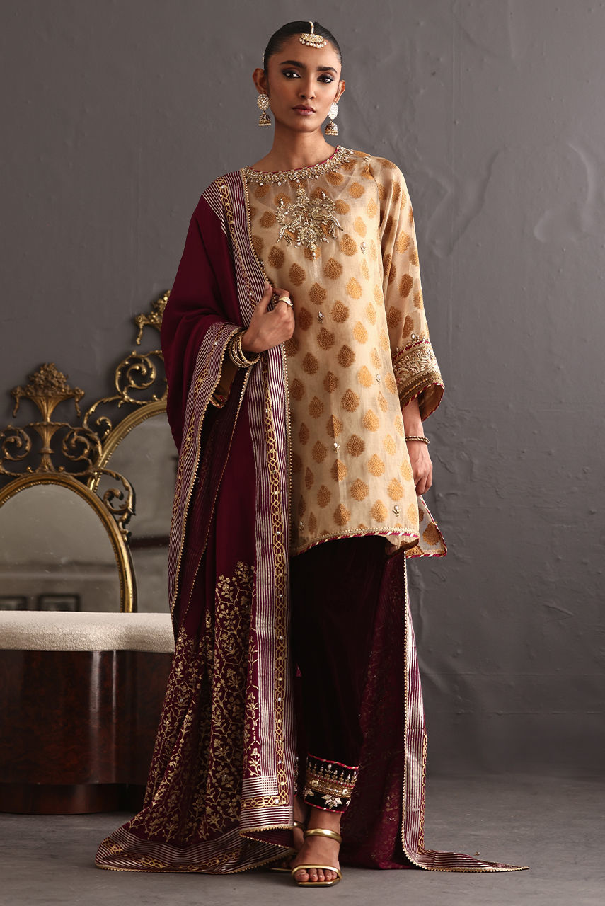 This three piece ensemble exudes grace and poise keeping the tradition intact. The short jacquard tunic features intricate zardozi and gara embroidery paired with a luscious berry velvet shalwar hand worked in delicate gotta work and zardozi. It is paired with a signature Deepak perwani crepe shawl hand block printed in shades of gold and white gold.