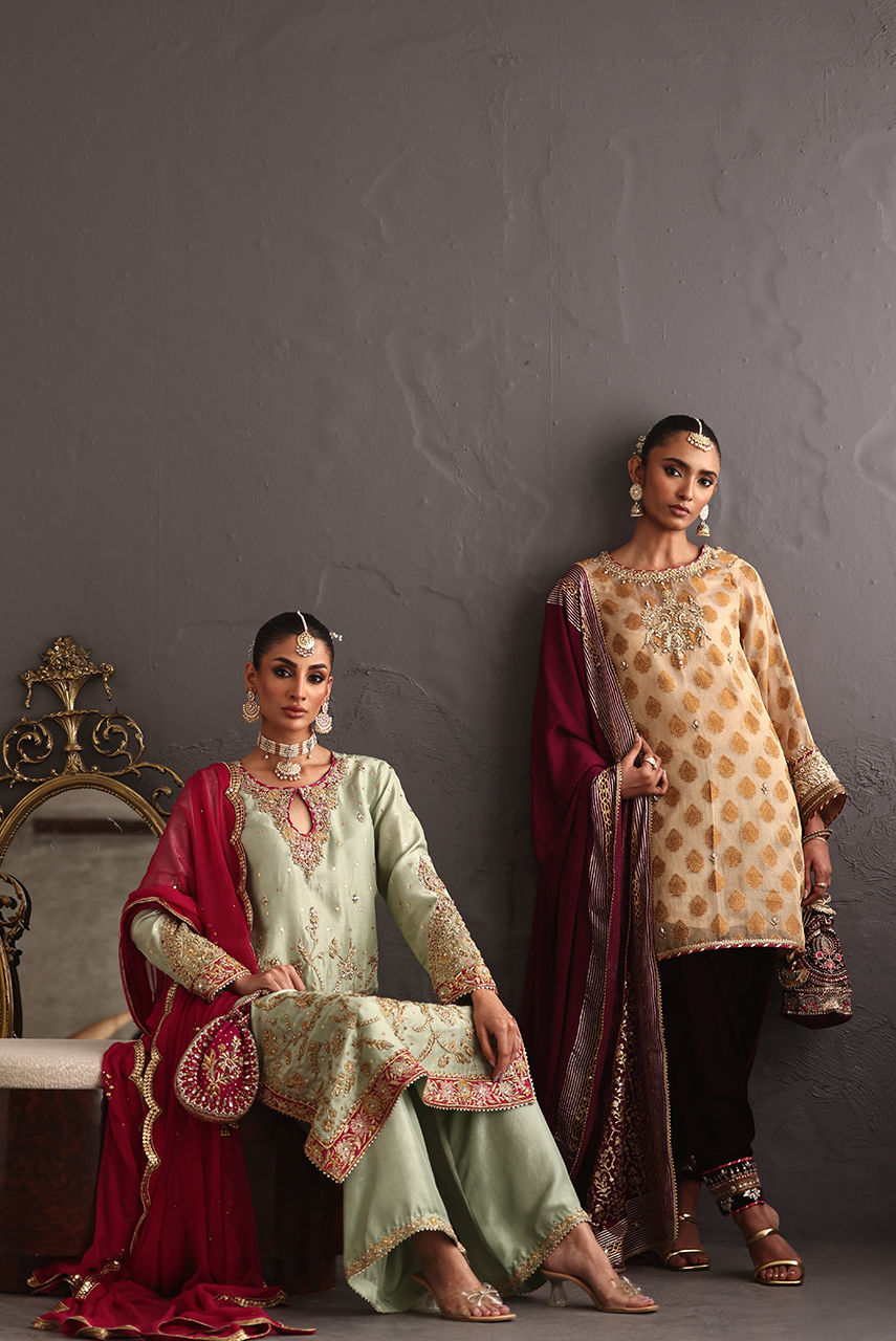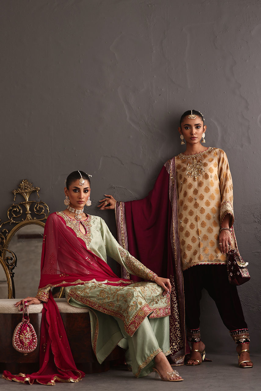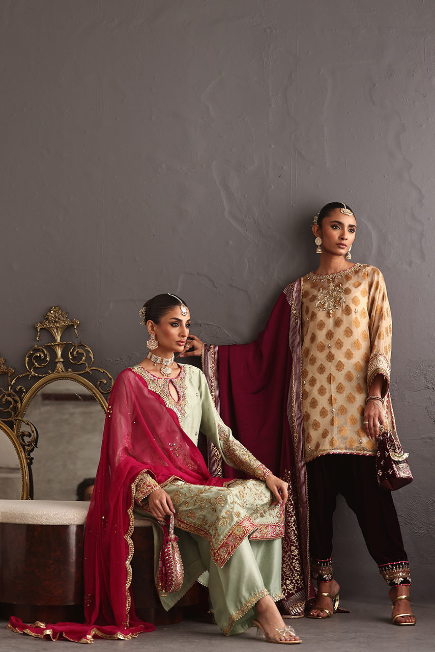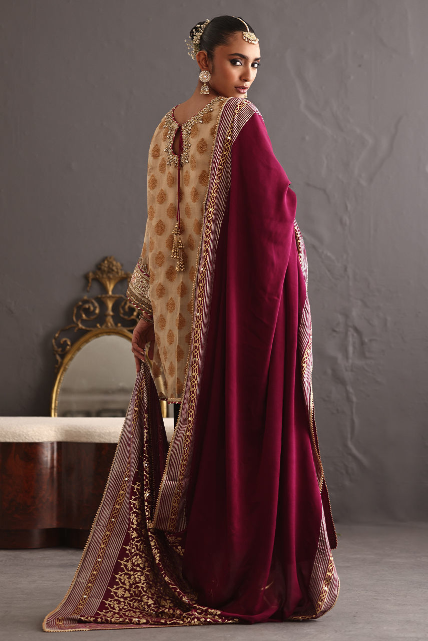 This three piece ensemble exudes grace and poise keeping the tradition intact. The short jacquard tunic features intricate zardozi and gara embroidery paired with a luscious berry velvet shalwar hand worked in delicate gotta work and zardozi. It is paired with a signature Deepak perwani crepe shawl hand block printed in shades of gold and white gold.