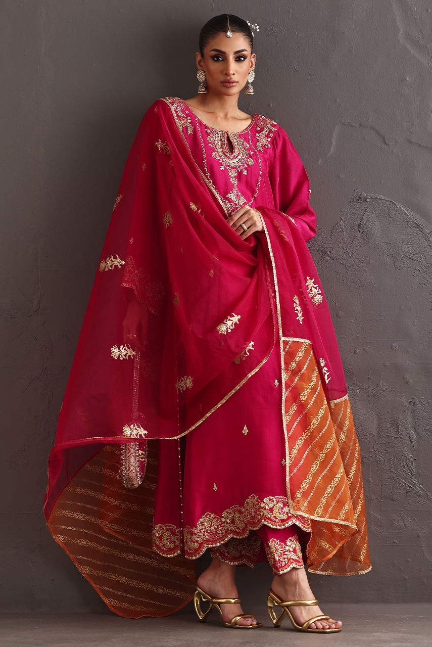 Radiating festive charm, a fuchsia raw silk ensemble featuring intricate zardozi work on the neckline, front, and sleeves, finished with embroidered borders on the sleeves and hem. Styled with a fuchsia and rust block-printed organza dupatta that adds depth and vibrance to the look.