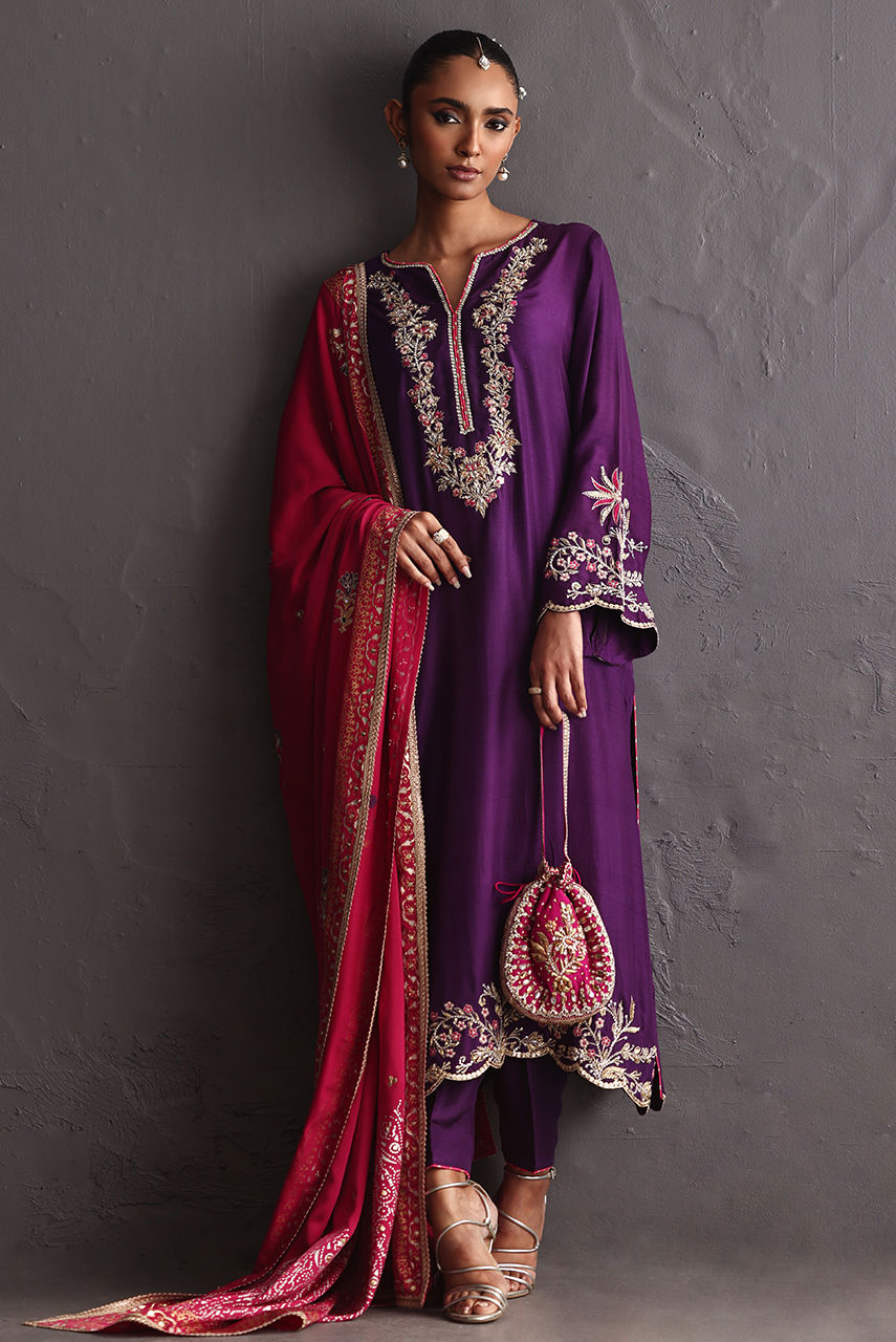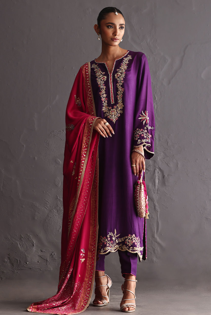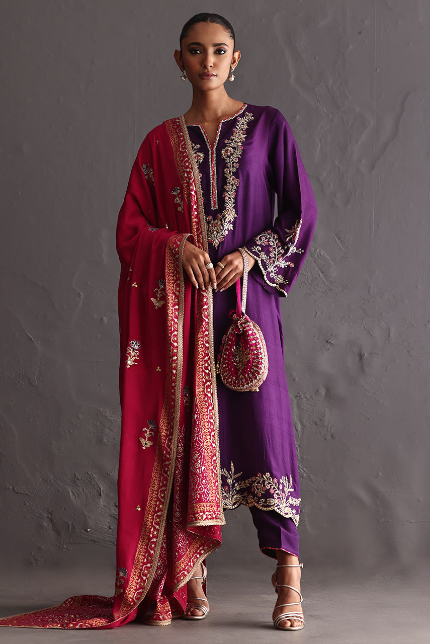 Embodying in a royal purple raw silk ensemble adorned with intricate zardozi detailing on the neckline and hem, paired with a fuchsia crepe block-printed shawl highlighted with delicate handwork. A seamless blend of craftsmanship and colour.