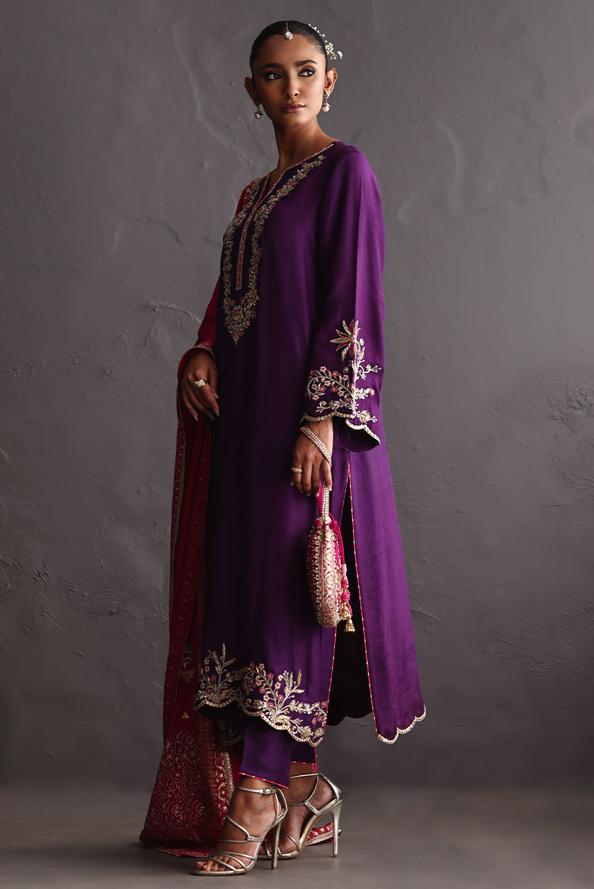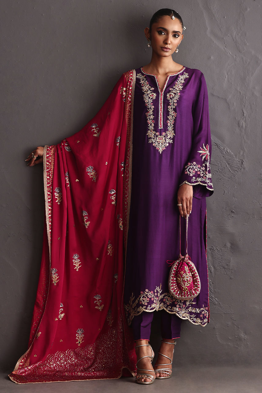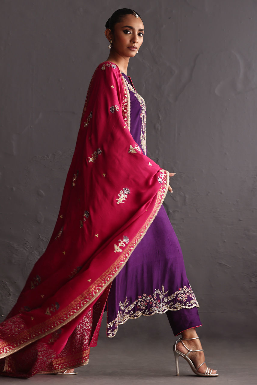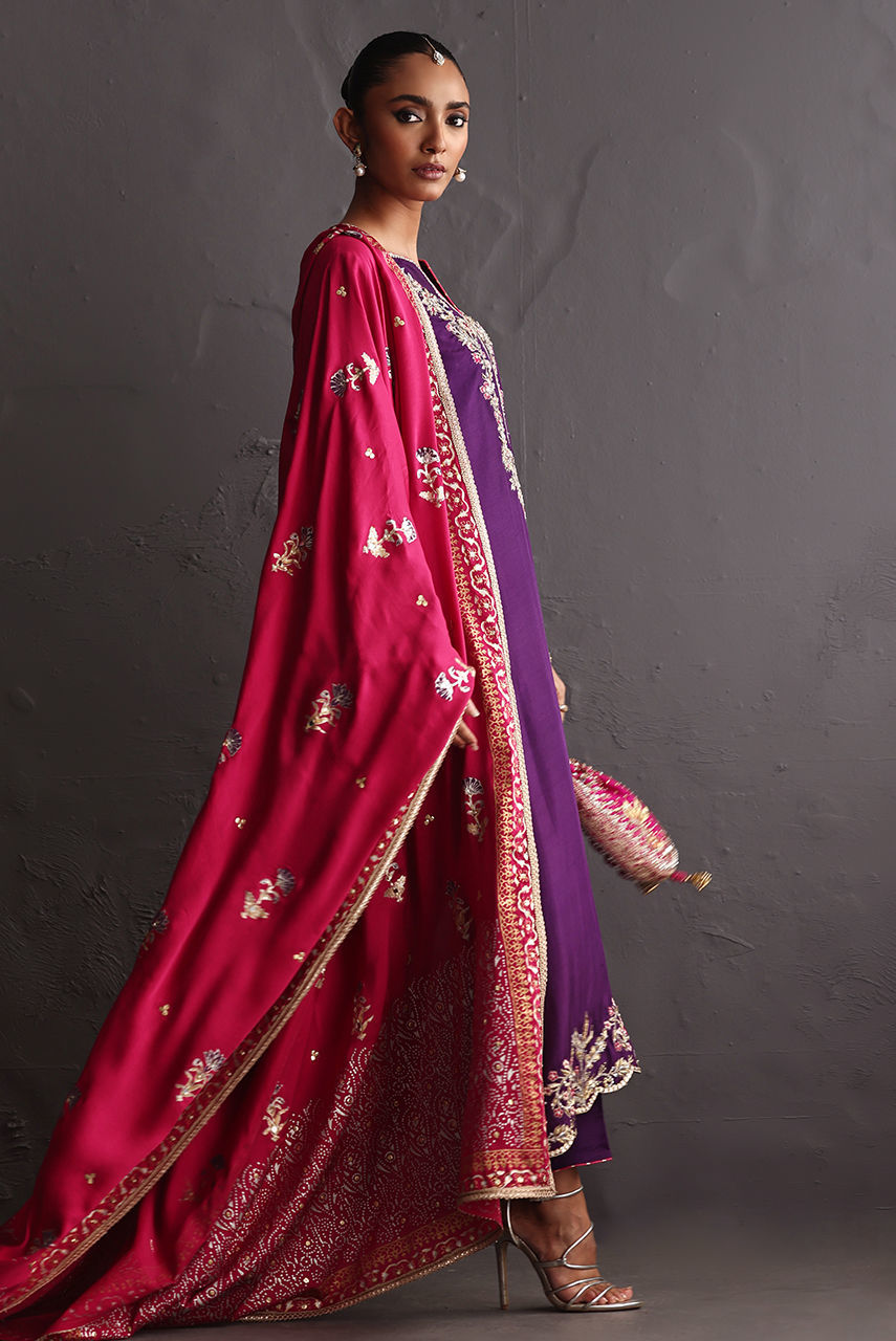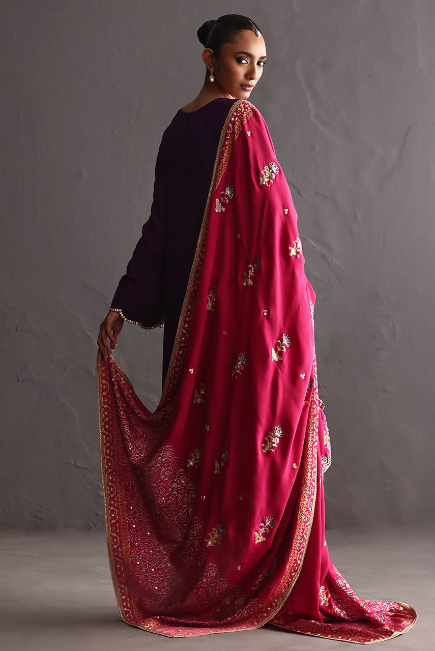 Embodying in a royal purple raw silk ensemble adorned with intricate zardozi detailing on the neckline and hem, paired with a fuchsia crepe block-printed shawl highlighted with delicate handwork. A seamless blend of craftsmanship and colour.