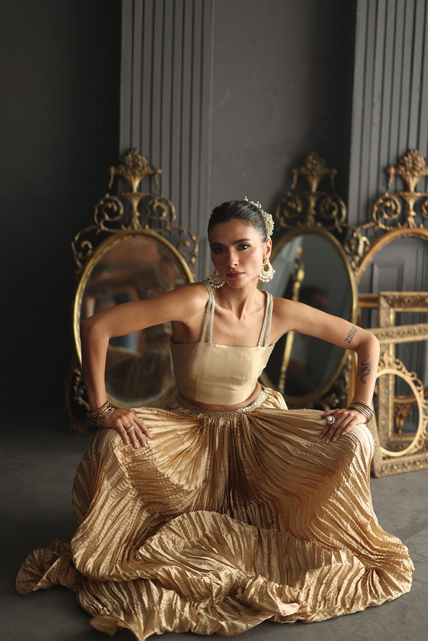 A champagne gold vision in tissue, this sleeveless column shirt embodies quiet grandeur in every detail. The lustrous surface shimmers with detailed cutwork in meticulous zardozi, resham and crystals, the embroidery frames the neckline, back and borders. Paired with a crushed bottom wired in elegant swirls. The heavy maisori dupatta features delicate repeat and jewel motifs handworked in zardozi. Sequin and crystals.