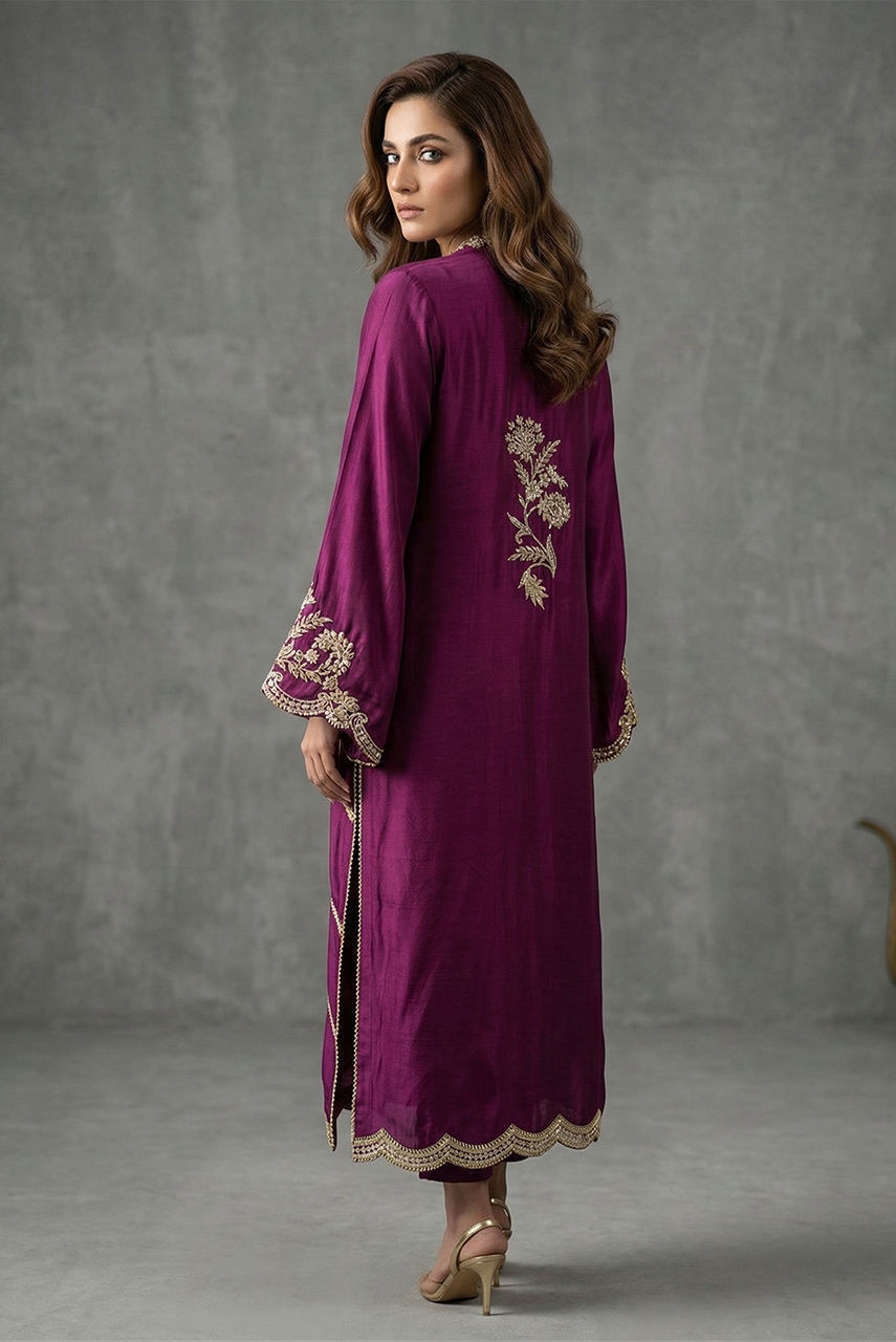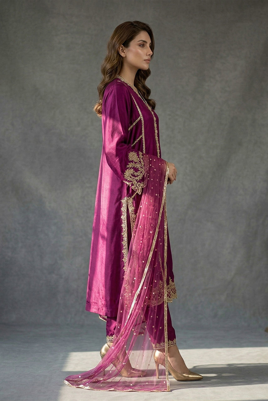 A rich magenta silk ensemble adorned with delicate gold embroidery along the neckline, sleeves and hem. Paired with straight pants and a dupatta embellished with subtle gold accents, this look blends timeless elegance with modern sophistication.