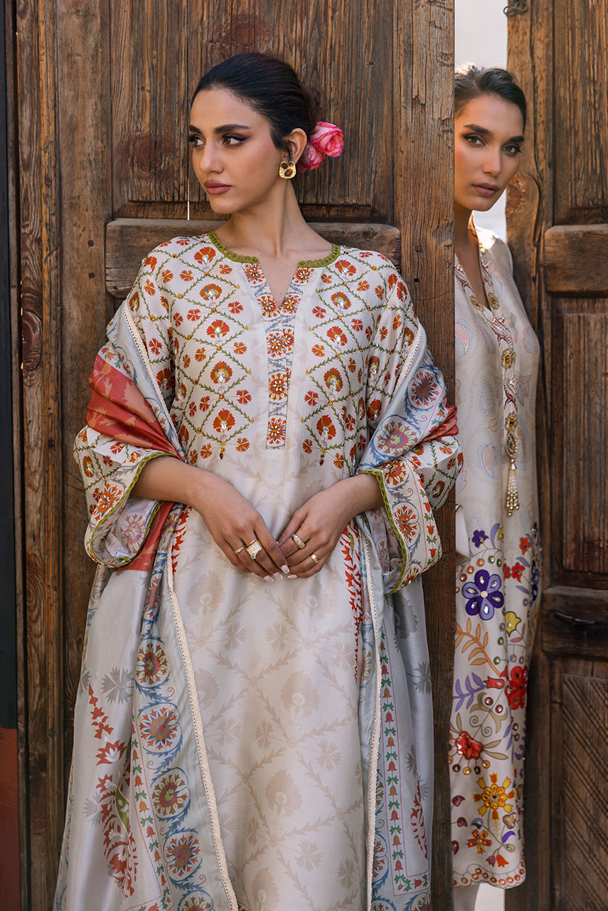 A pure silk printed shirt featuring Suzani inspired motifs layered beautifully in a warm colour palette, this print is classic and effortlessly elegant. Hand worked in stones, diamanté, sequins and beads. It is paired with a digital print dupatta finished with lace.