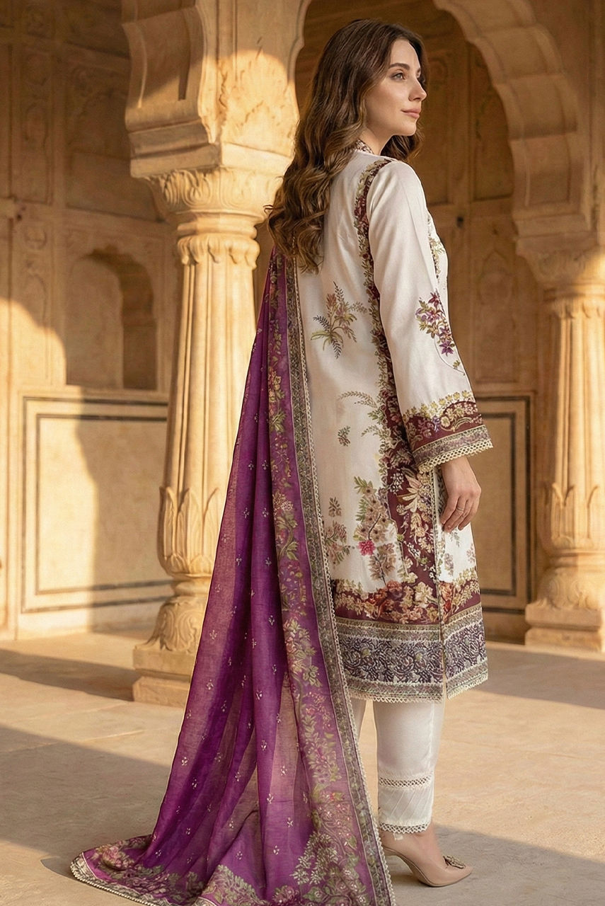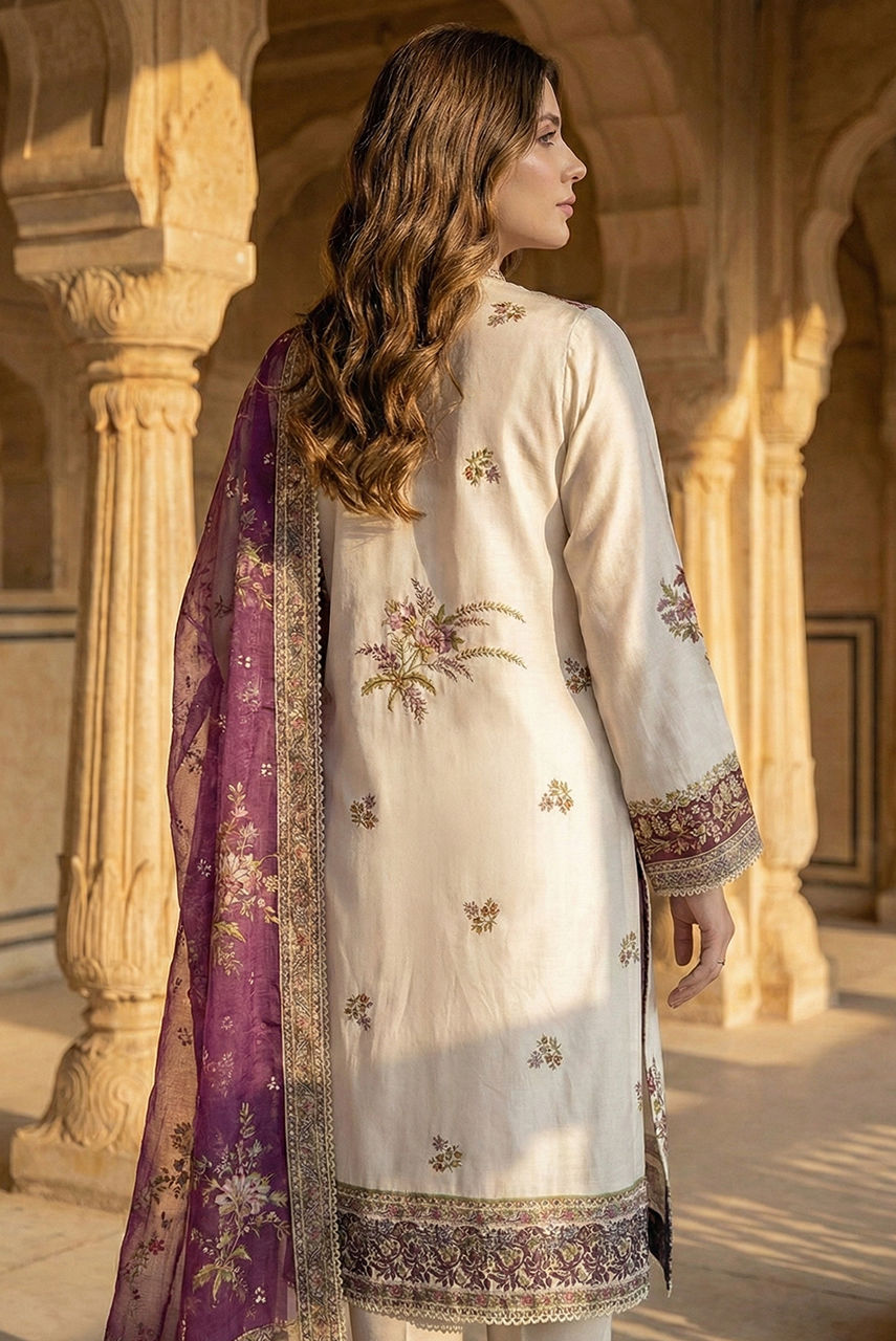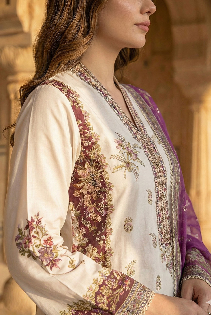 Deepak Perwani signature prints featuring chintz inspired motifs making a dramatic visual impact. Pure silk shirt and silk printed dupattas. The shirt is hand embellished meticulously in stones, beads and sequins. The dupatta is finished in lace. Paired with a matching pant