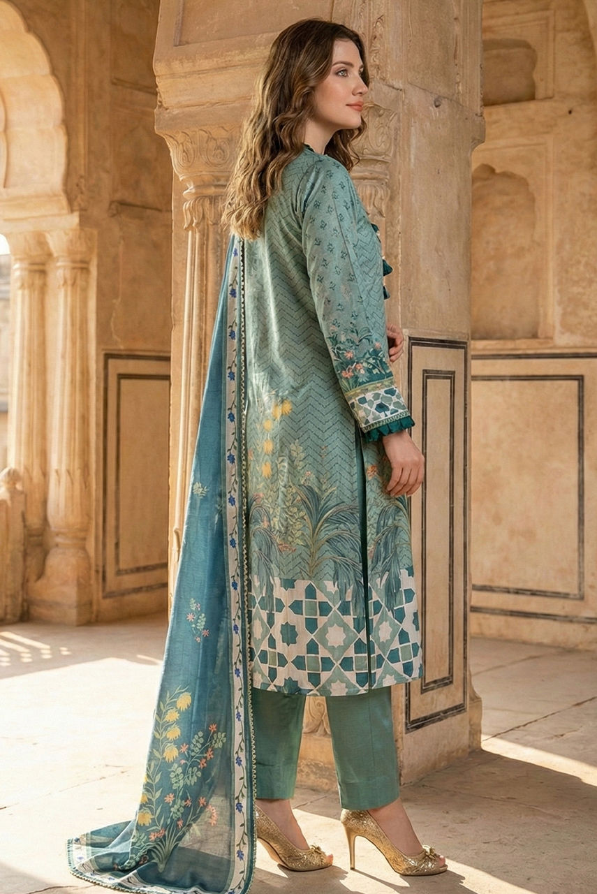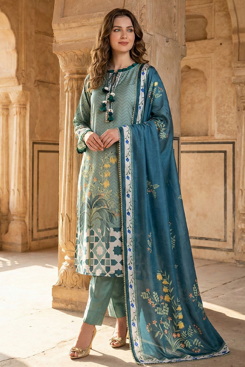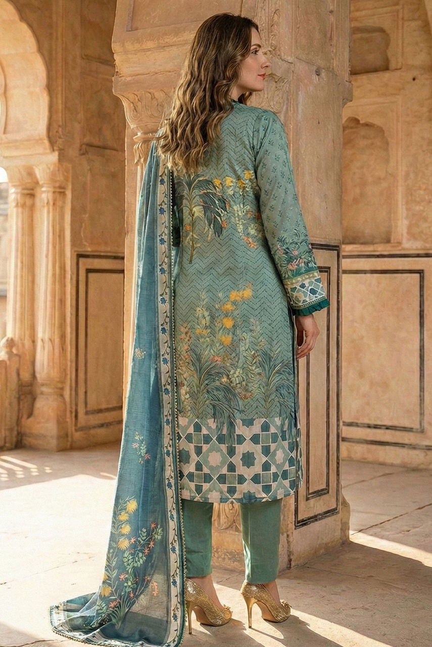 Deepak Perwani signature prints featuring tropical motifs making a dramatic visual impact. Pure silk shirt and silk printed dupattas. The shirt is hand embellished meticulously in stones, beads and sequins. The dupatta is finished in lace. Paired with a matching pant.