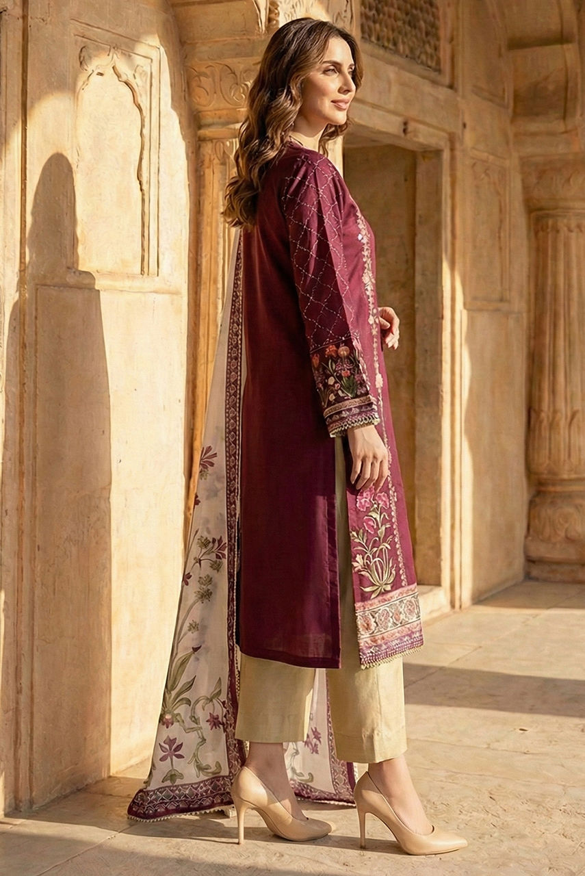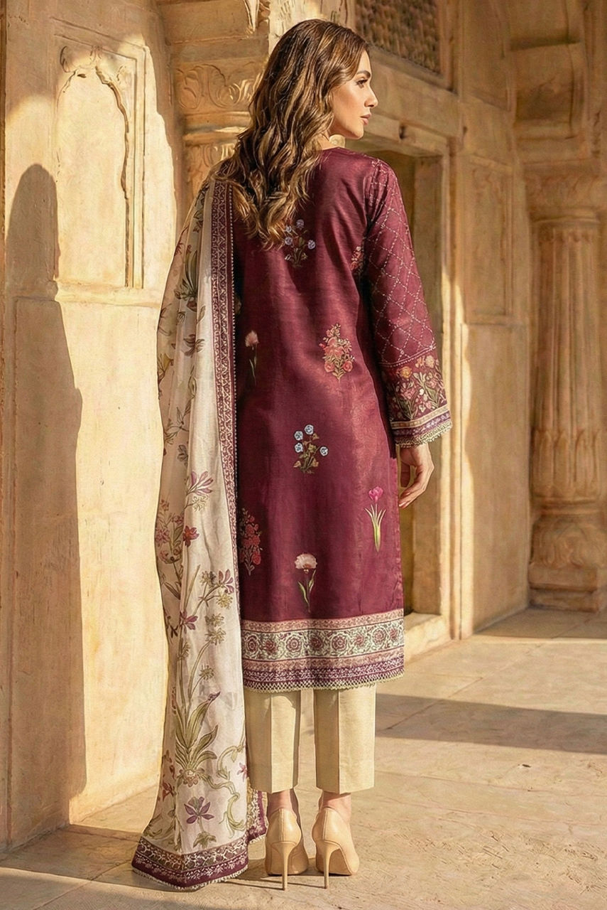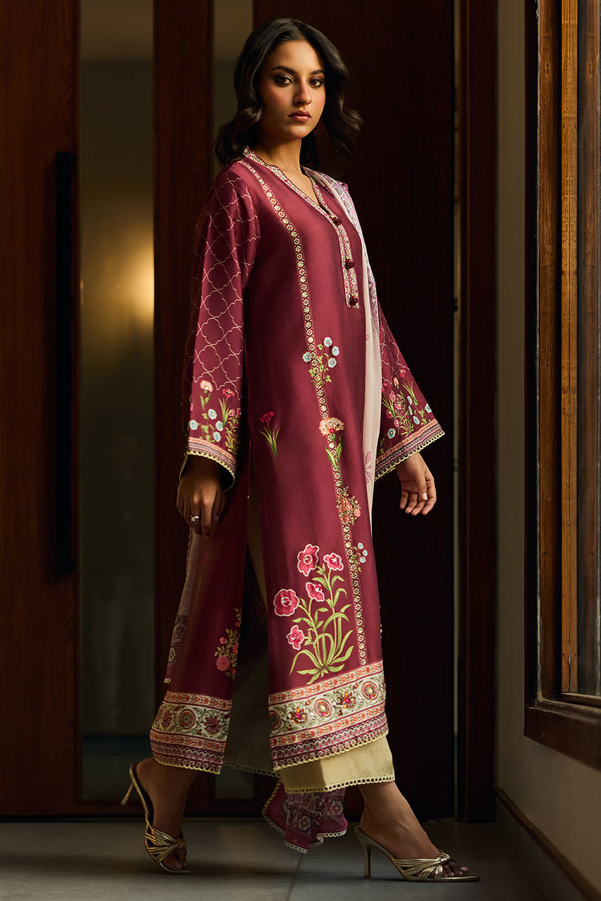 A pure silk printed shirt featuring flora and fauna layered beautifully in a warm colour palette, this print is classic and effortlessly elegant. Hand worked in stones, diamanté, sequins and beads. It is paired with a digital print dupatta finished with lace. Featuring a plain trouser