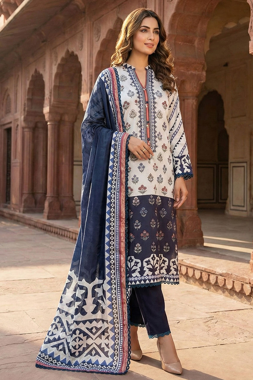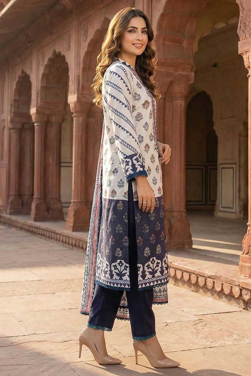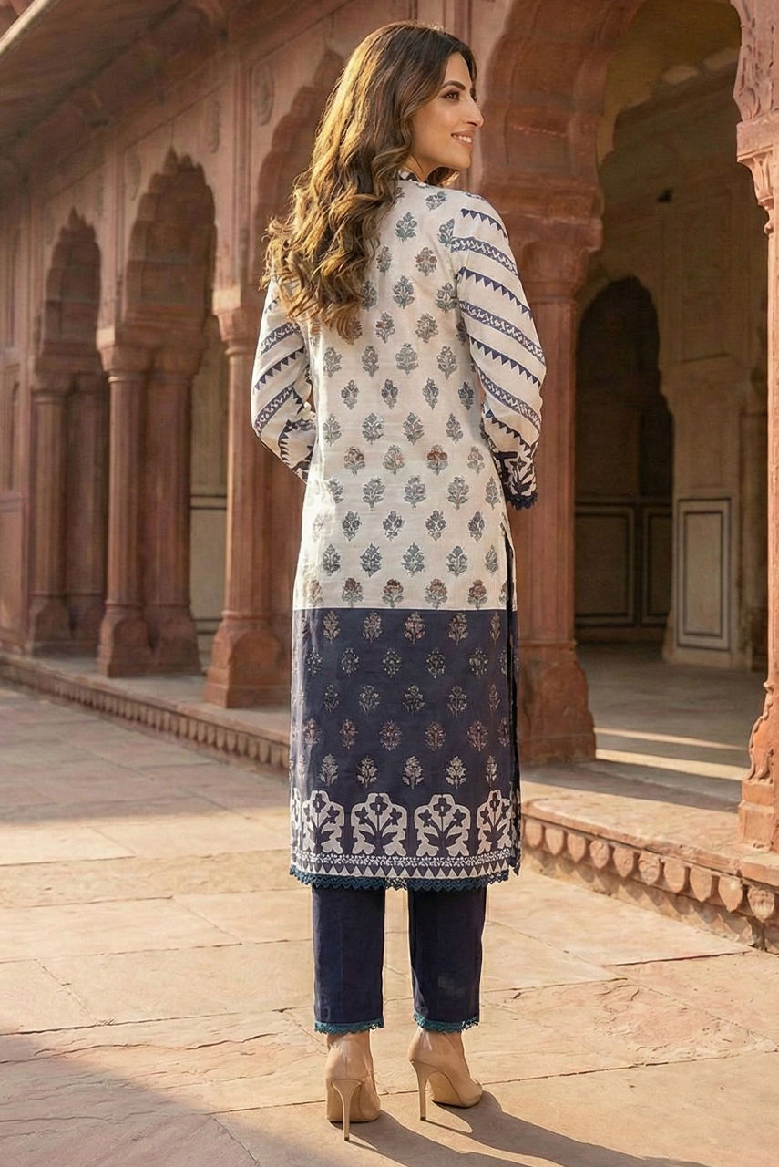 The story of handmade appliqué translated into a flat yet dimensional design.the silk printed shirt features hand work in sequin, diamanté and pearls. Paired with a silk dupatta and trousers finished with lace.