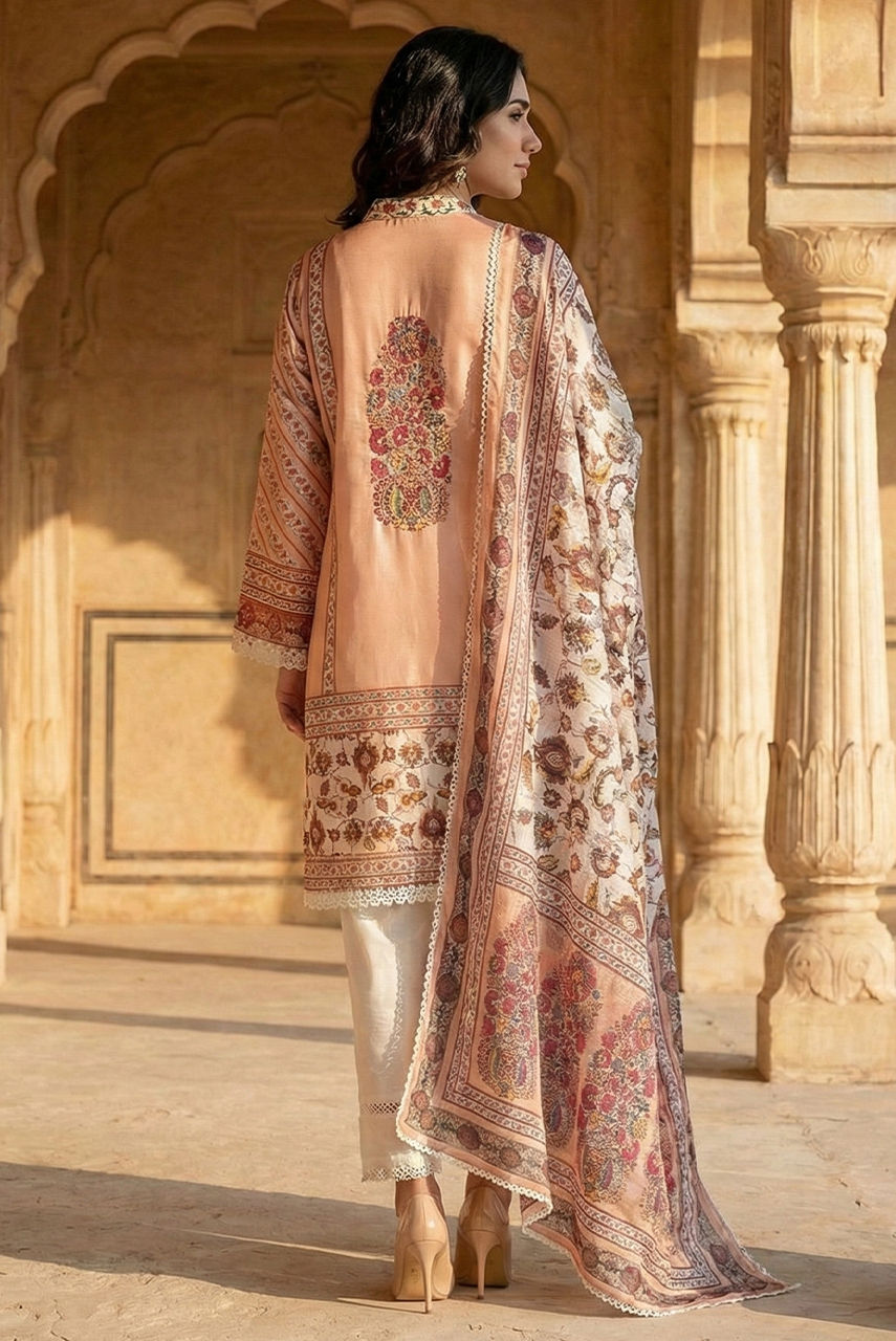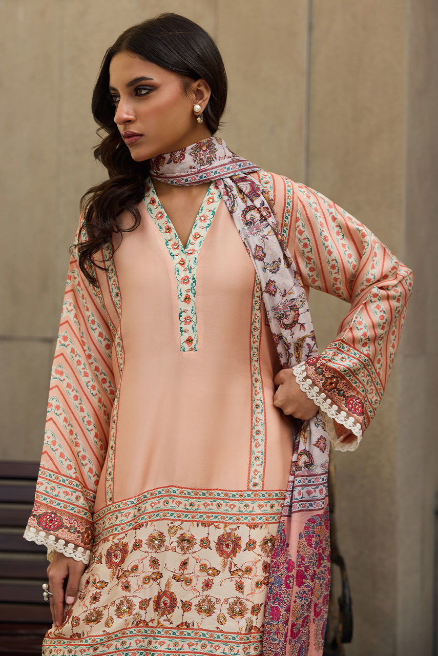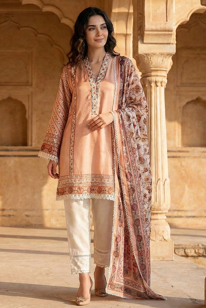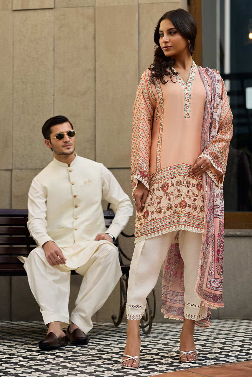 Graceful and quietly sophisticated This printed silk shirt is enhanced with an intricate handwork adorned with delicate sequin diamanté.The loom is, elevated by the silk dupatta finished with lace. Paired with a trouser, finished with lace.