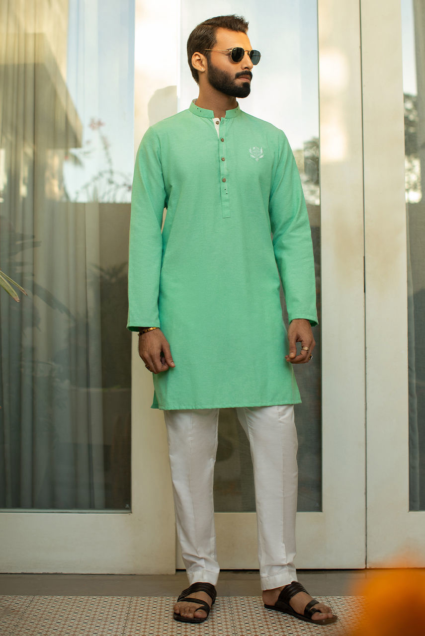 A mint green chambrey kurta with thread work detailing on the placket and embroidered DP logo.