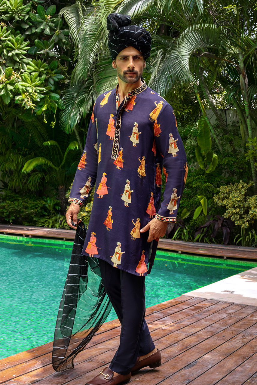 Navy blue charmeuse silk digitally printed Maharaja kurta pajama.