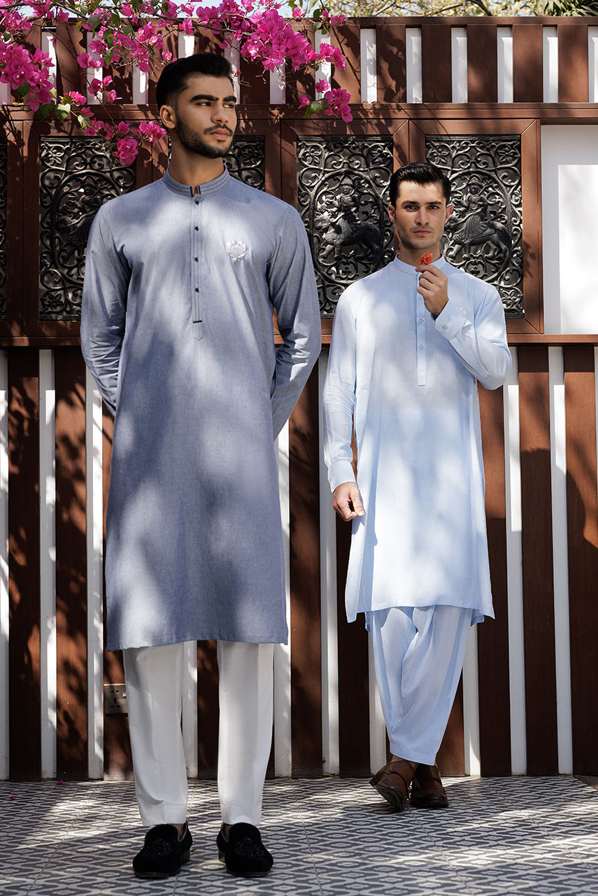Blue textured chambrey kurta with button detailing paired with a pajama.