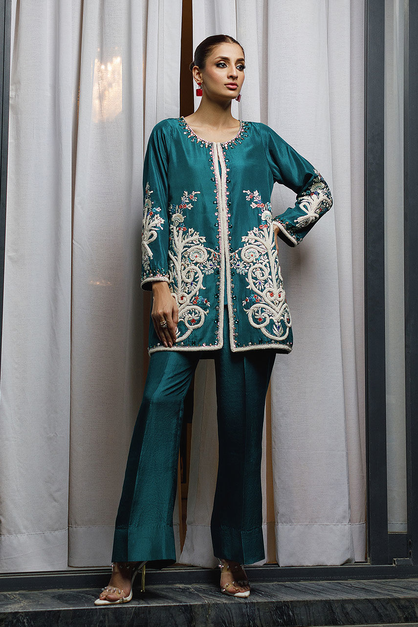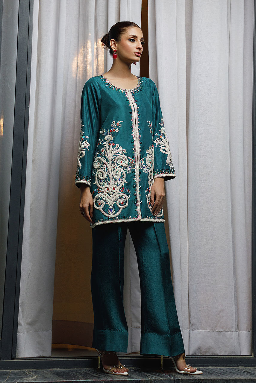 This pure raw silk jacket and bootcut pants featuring extensive hand embroidery in Resham Dori and diamonte make this piece exclusive and luxurious. It is embroidered taking inspiration from exclusive jewelry pieces