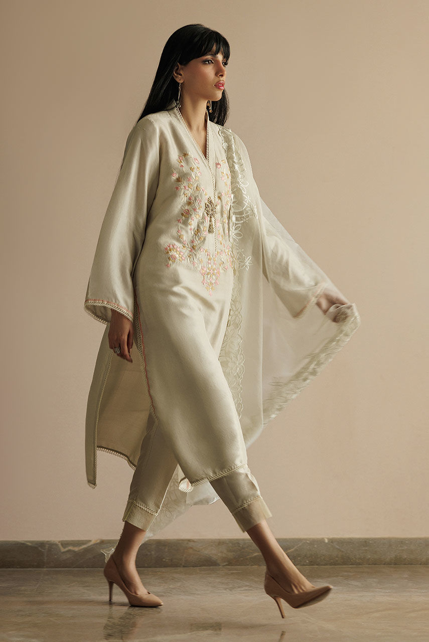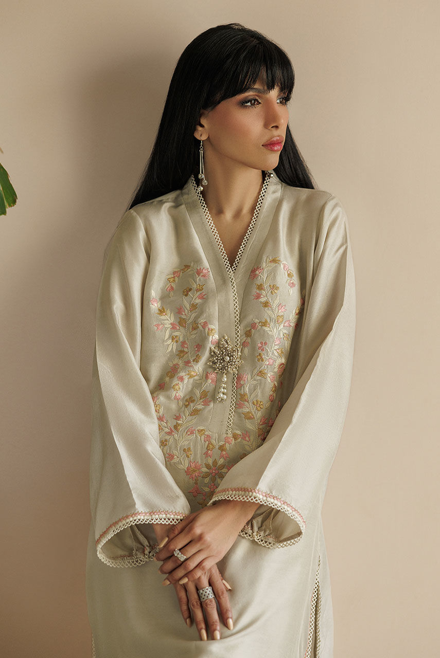 A pure raw silk tunic featuring extensive embroidery in shades of pink and off-white with hand worked broach. It is paired with straight pants finished with organza and lace. It is paired with an embroidered organza dupatta.