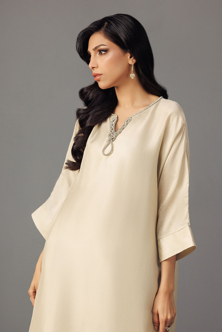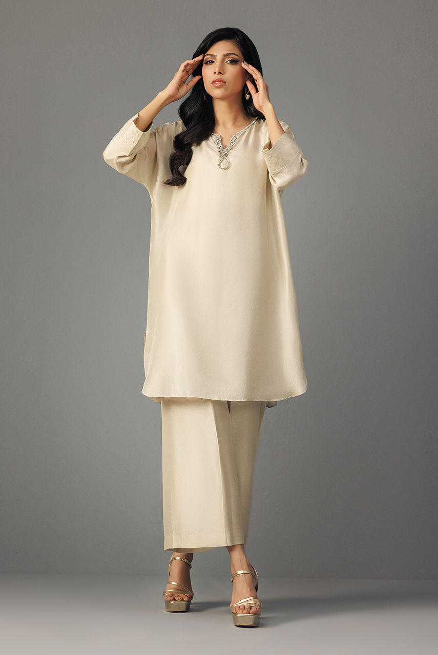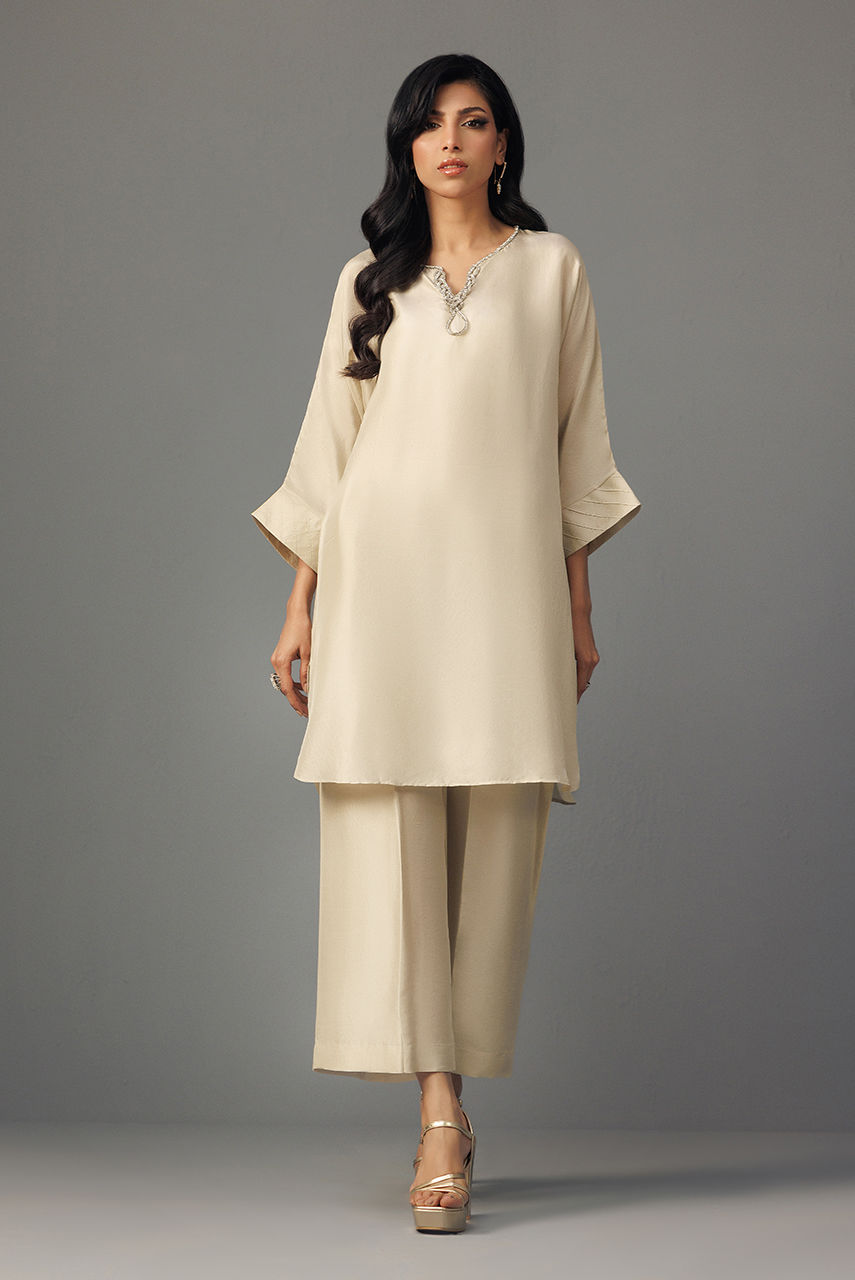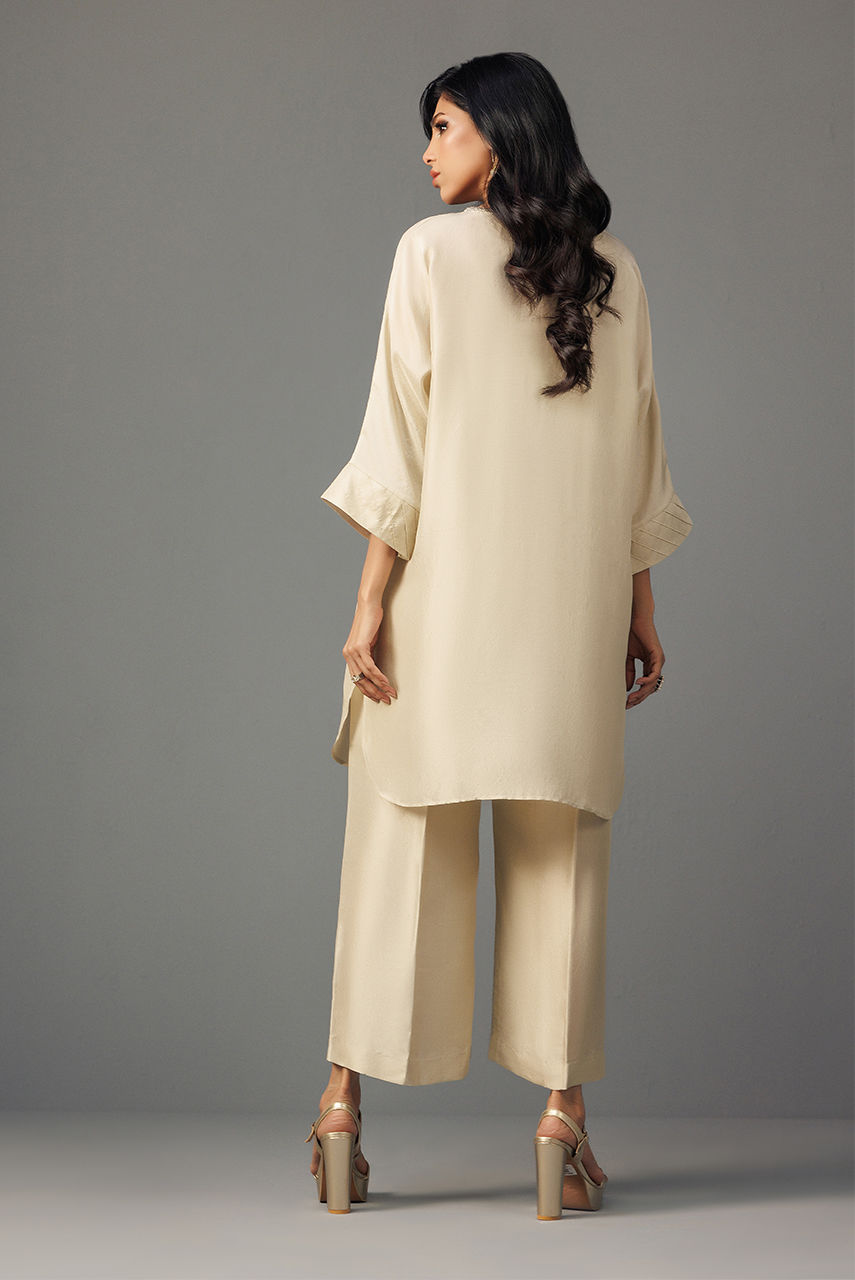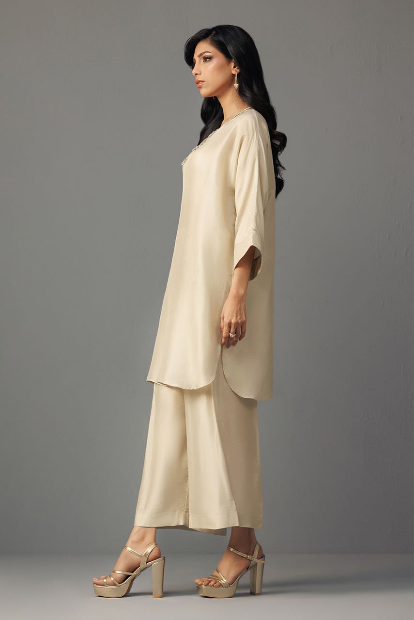 Cut in a pure raw silk fabric this co-ord set features a handcrafted jewel neckline with pleated detail on the sleeves. Paired with a raw silk palazzo
