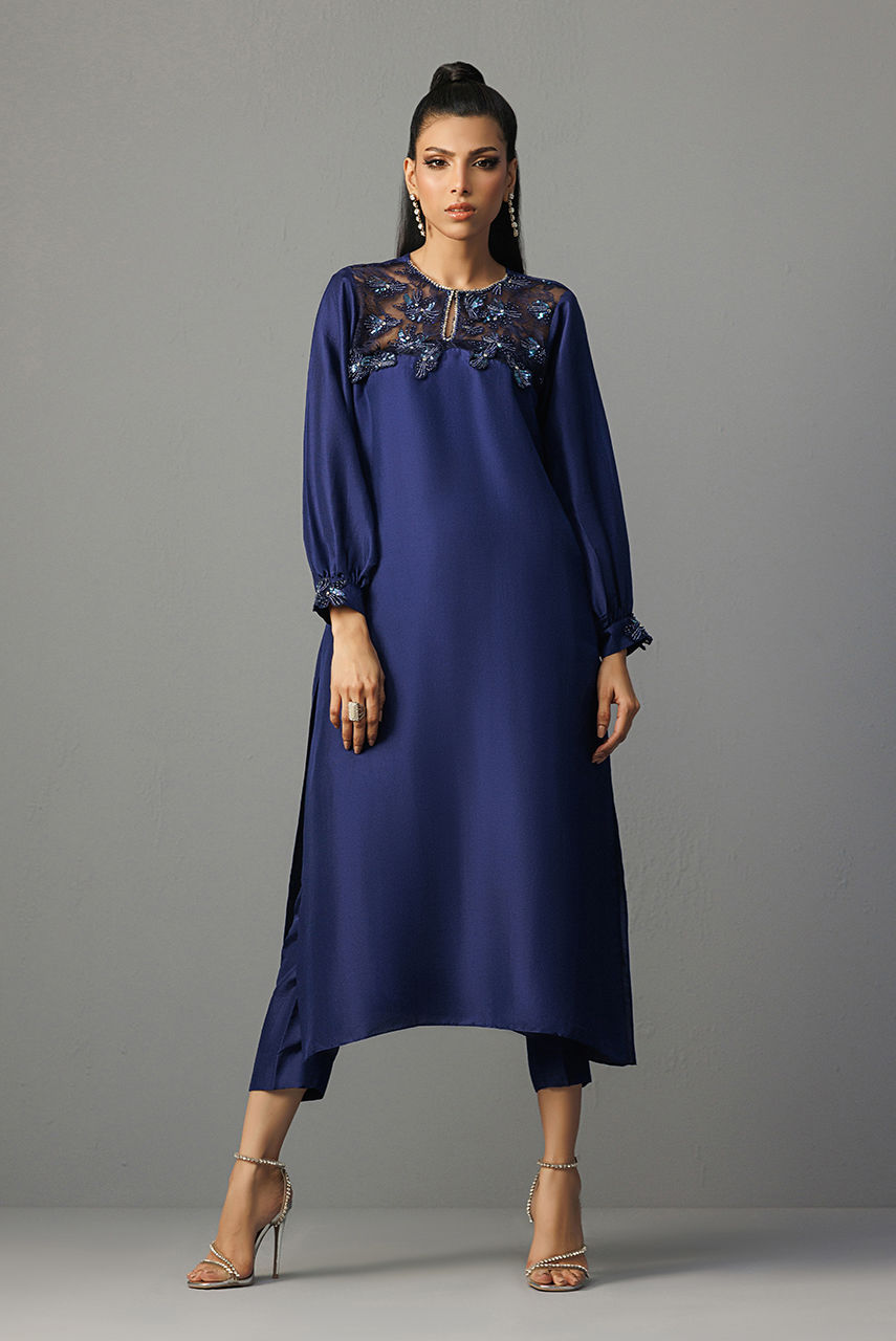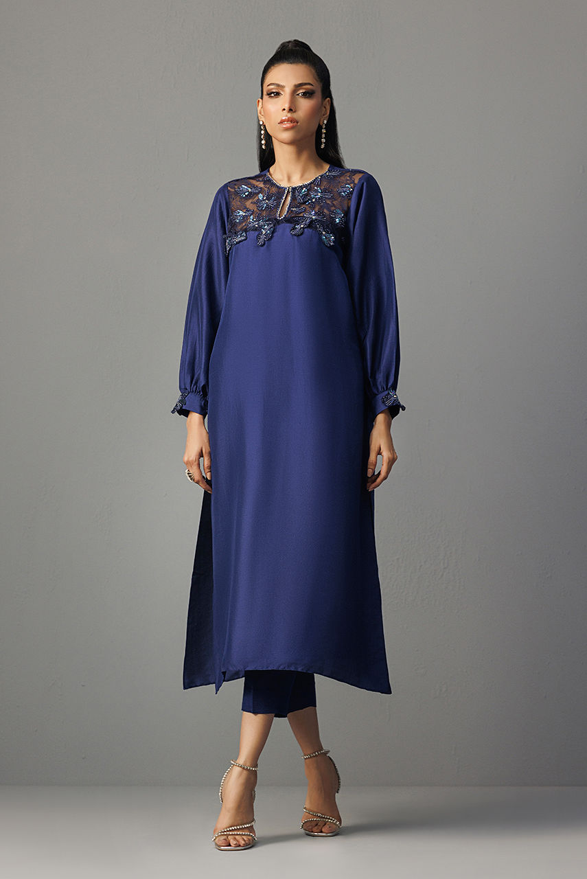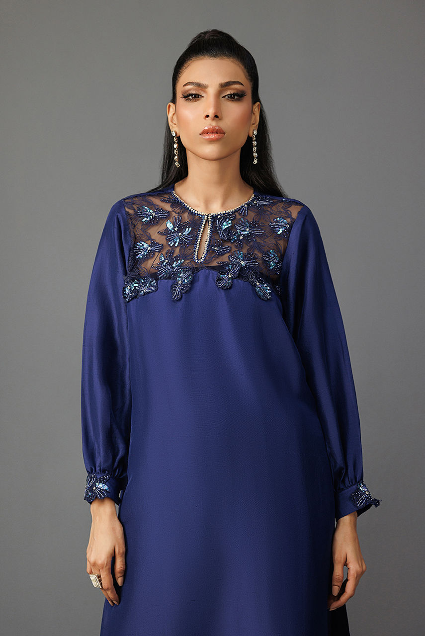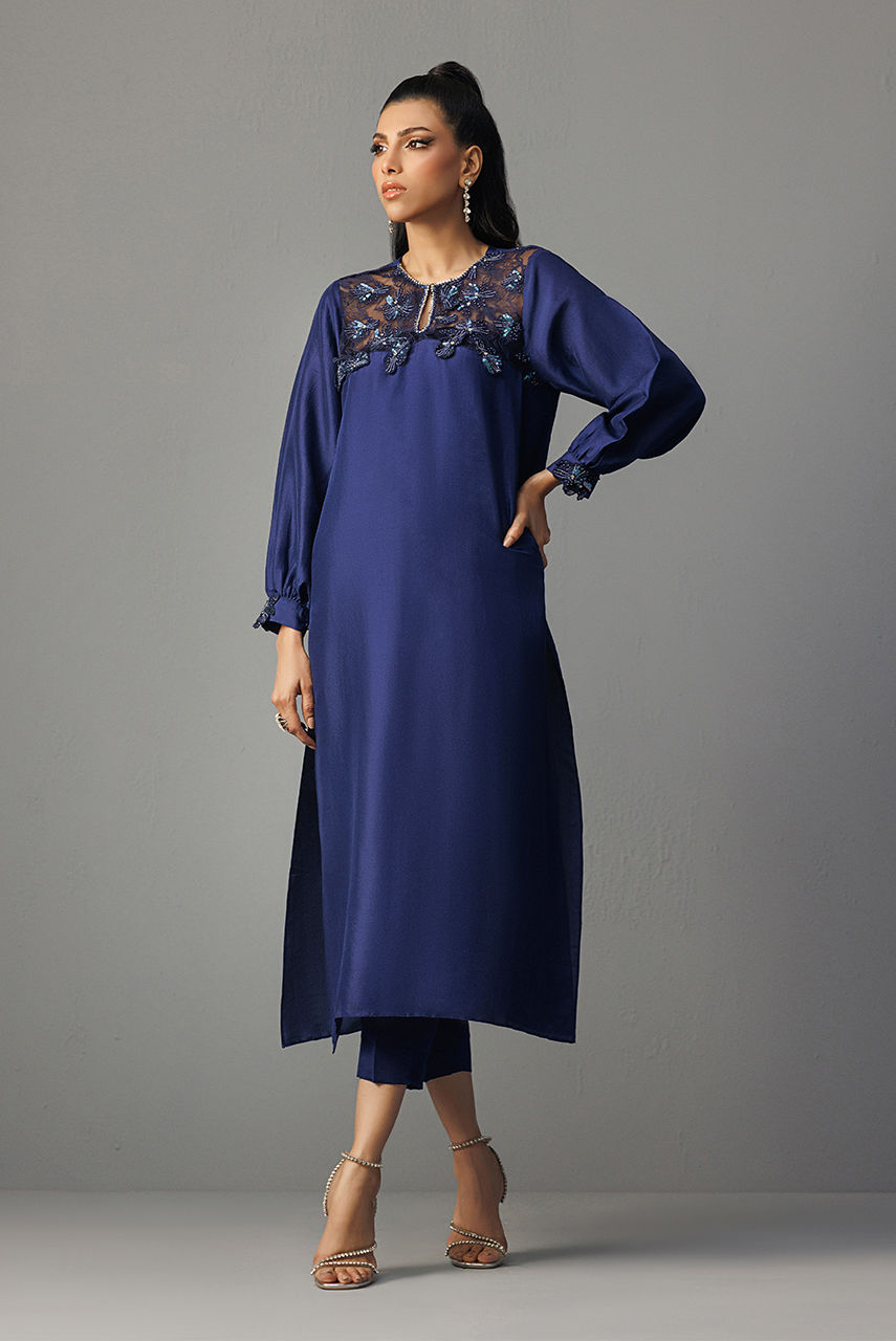 Cut from pure raw silk this shirt is enhanced with lace and 3d hand work in beautiful katt Dana, sequin and bead work. Paired with pure raw silk pants
