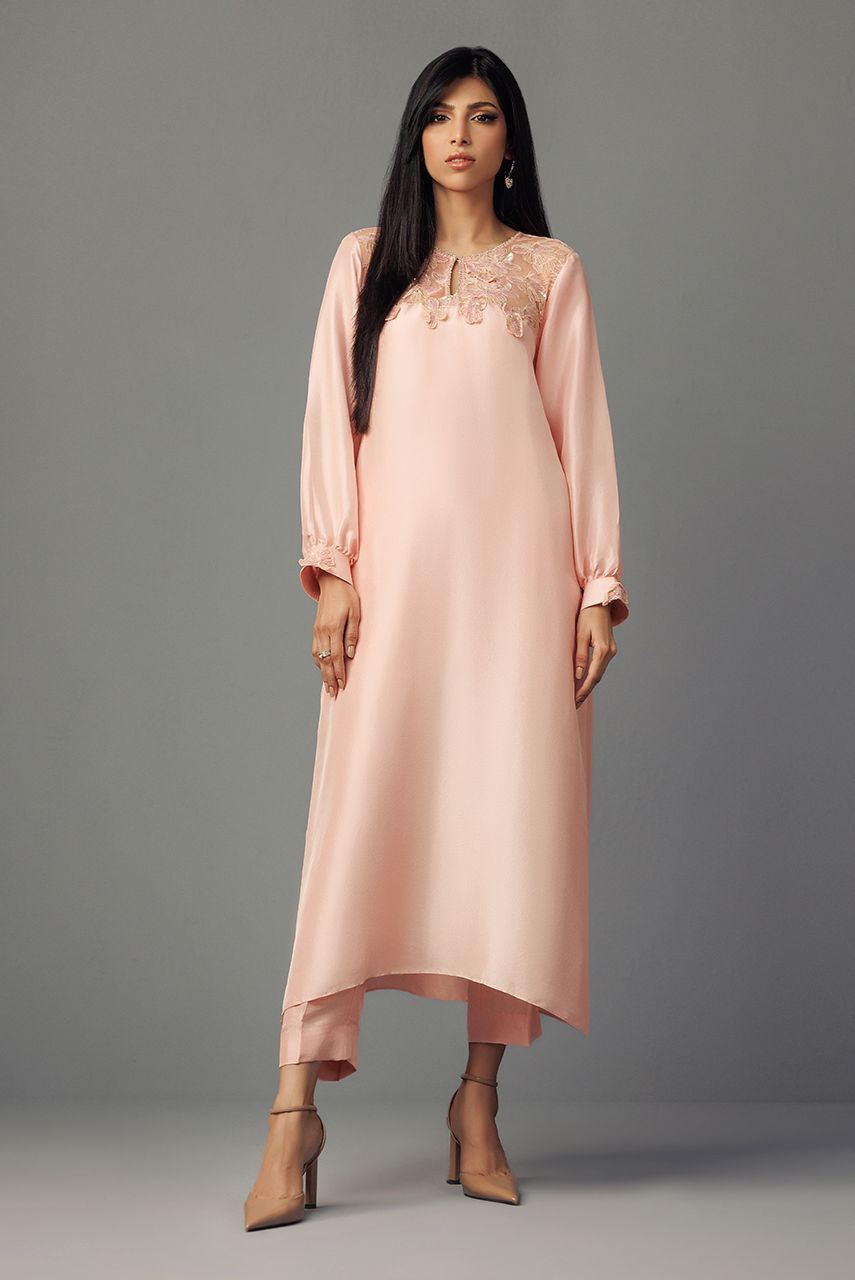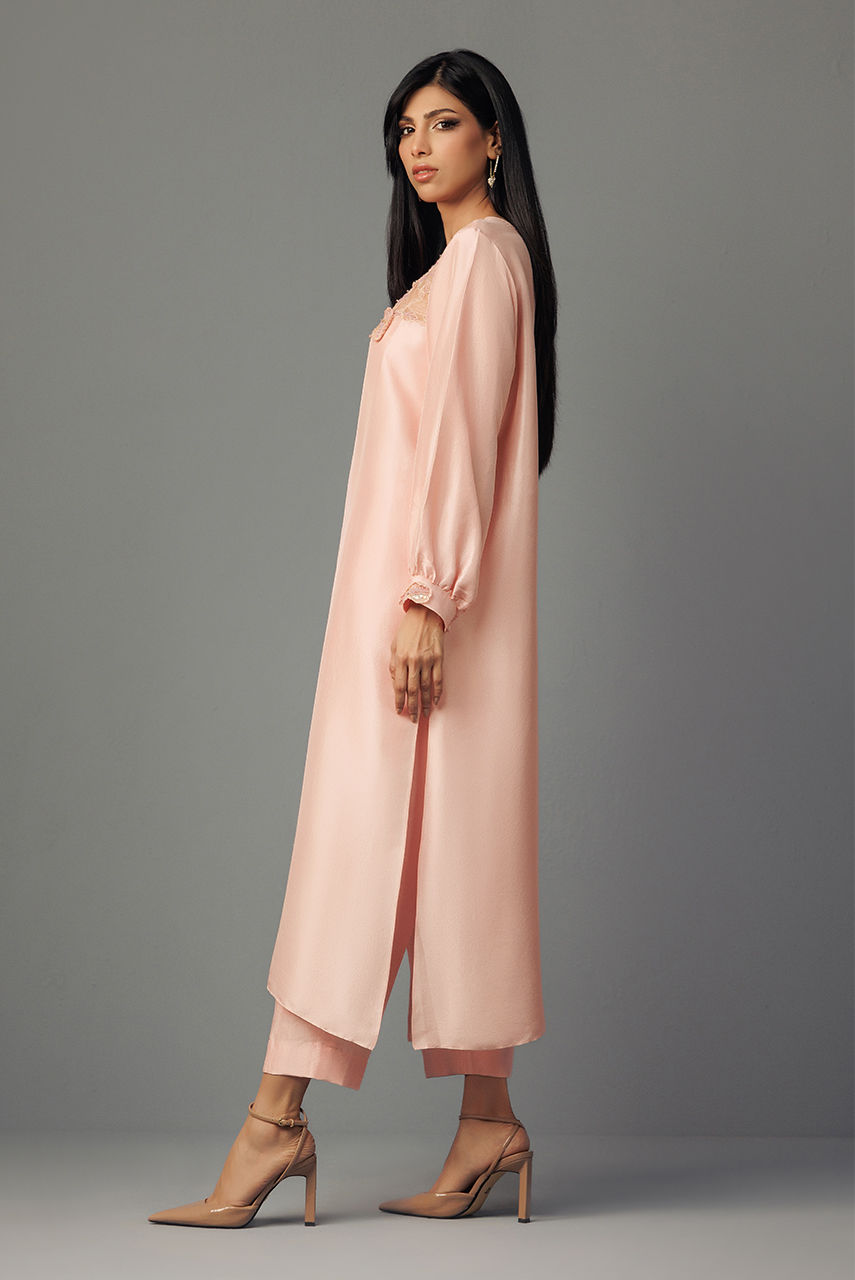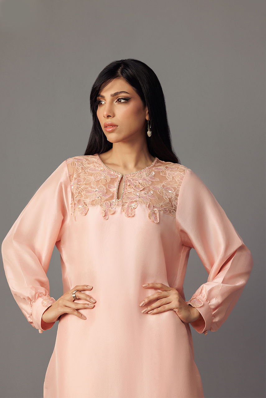 Pure raw silk shirt featuring embroidered net with 3d floral embroidery in Kat Dana, sequin, diamante and beads. It is paired with pure raw silk pants.