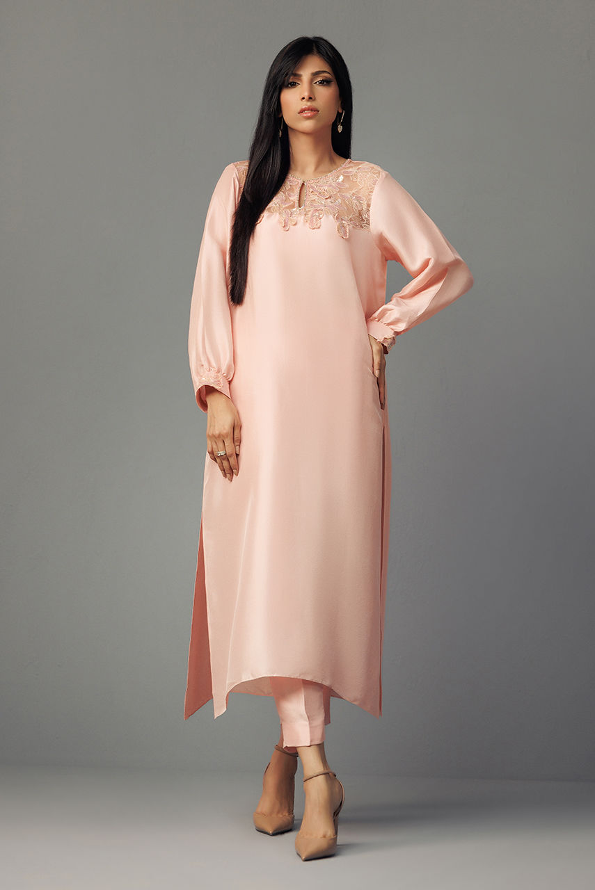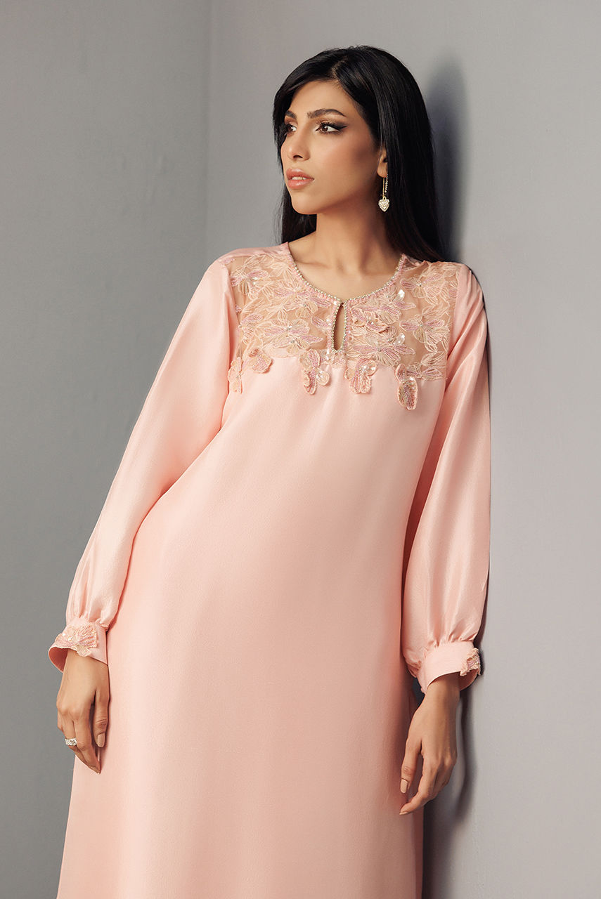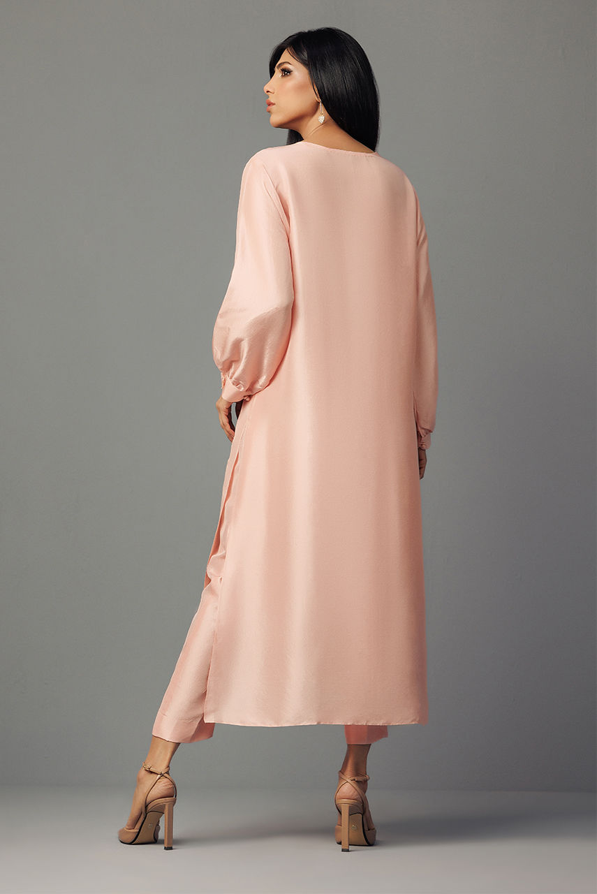Pure raw silk shirt featuring embroidered net with 3d floral embroidery in Kat Dana, sequin, diamante and beads. It is paired with pure raw silk pants.