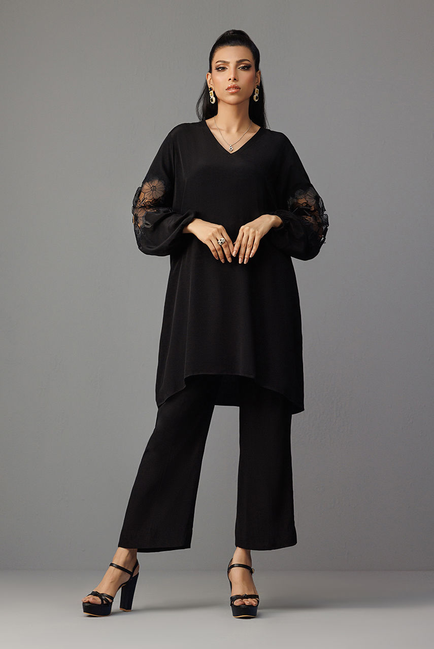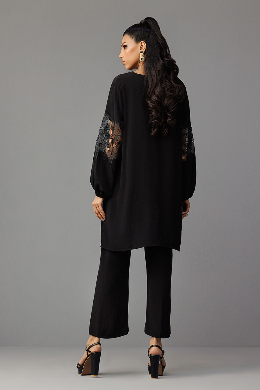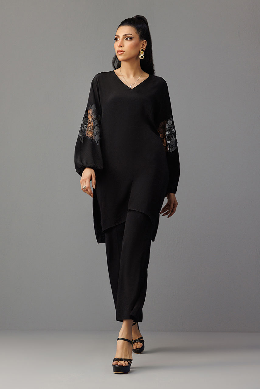 A black georgette top with cut work embroidery detail on the sleeves paired with georgette pants.