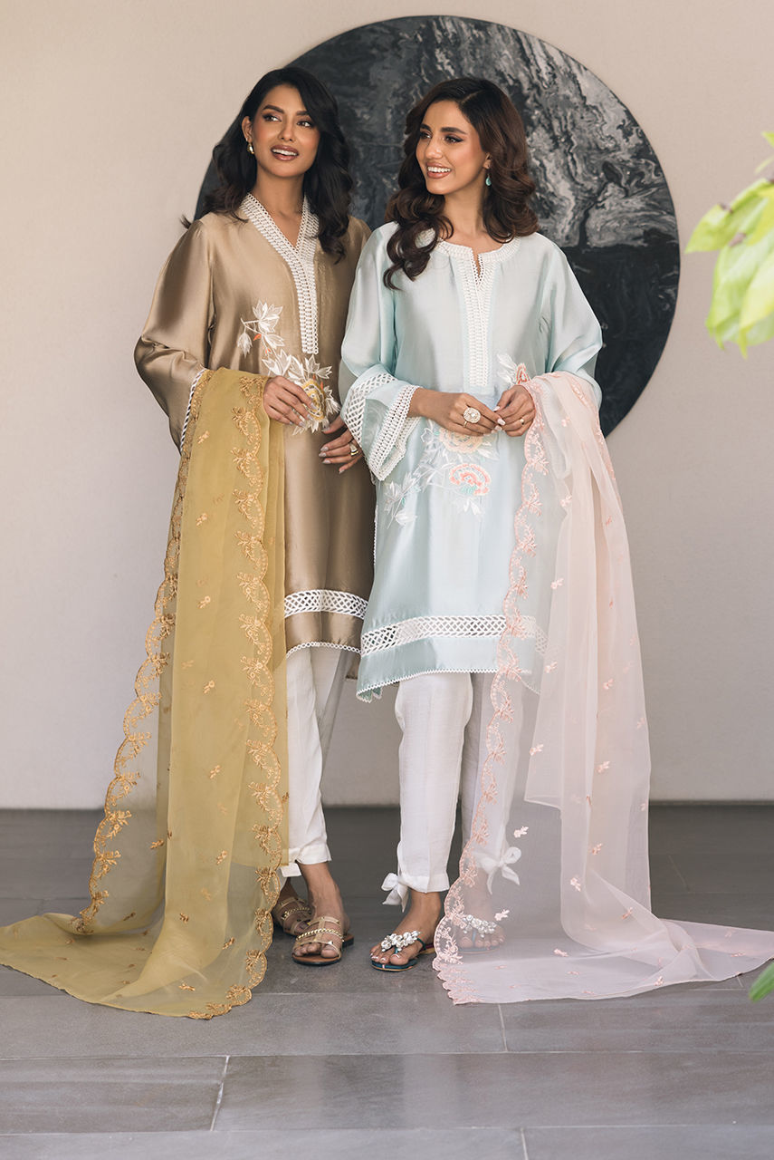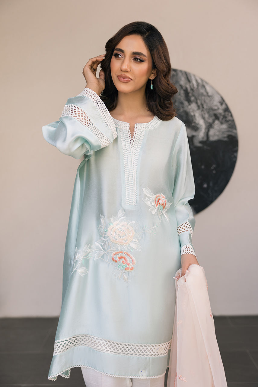 Powder blue shirt featuring Embroidry inspired by the Chinese chrysanthemums meticulously finished with cutwork embroidery and laces. The pink organza Dupatta is embroidered in delicate scallop embroidery. It is paired with the Thai pants. Fabric for Shirt shisha Silk. Fabric for trouser bamber silk.