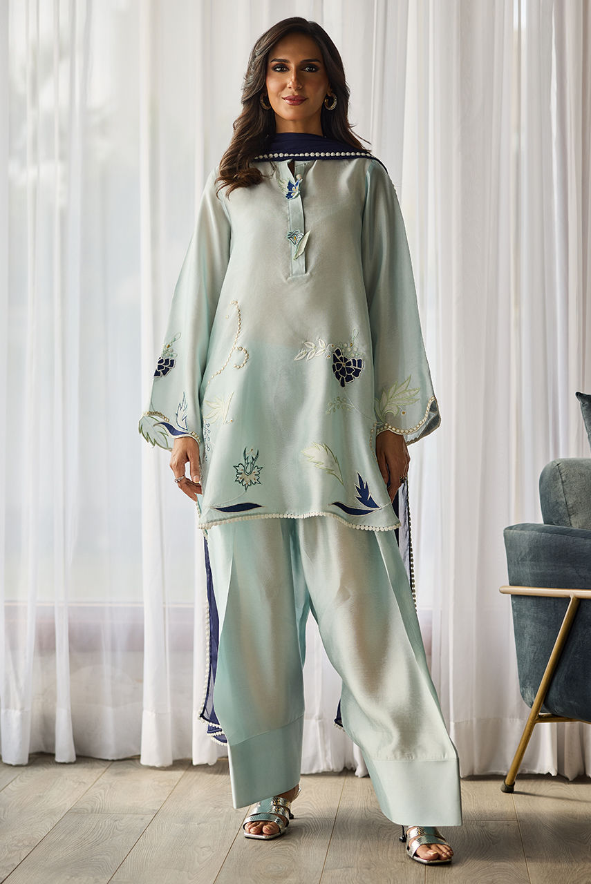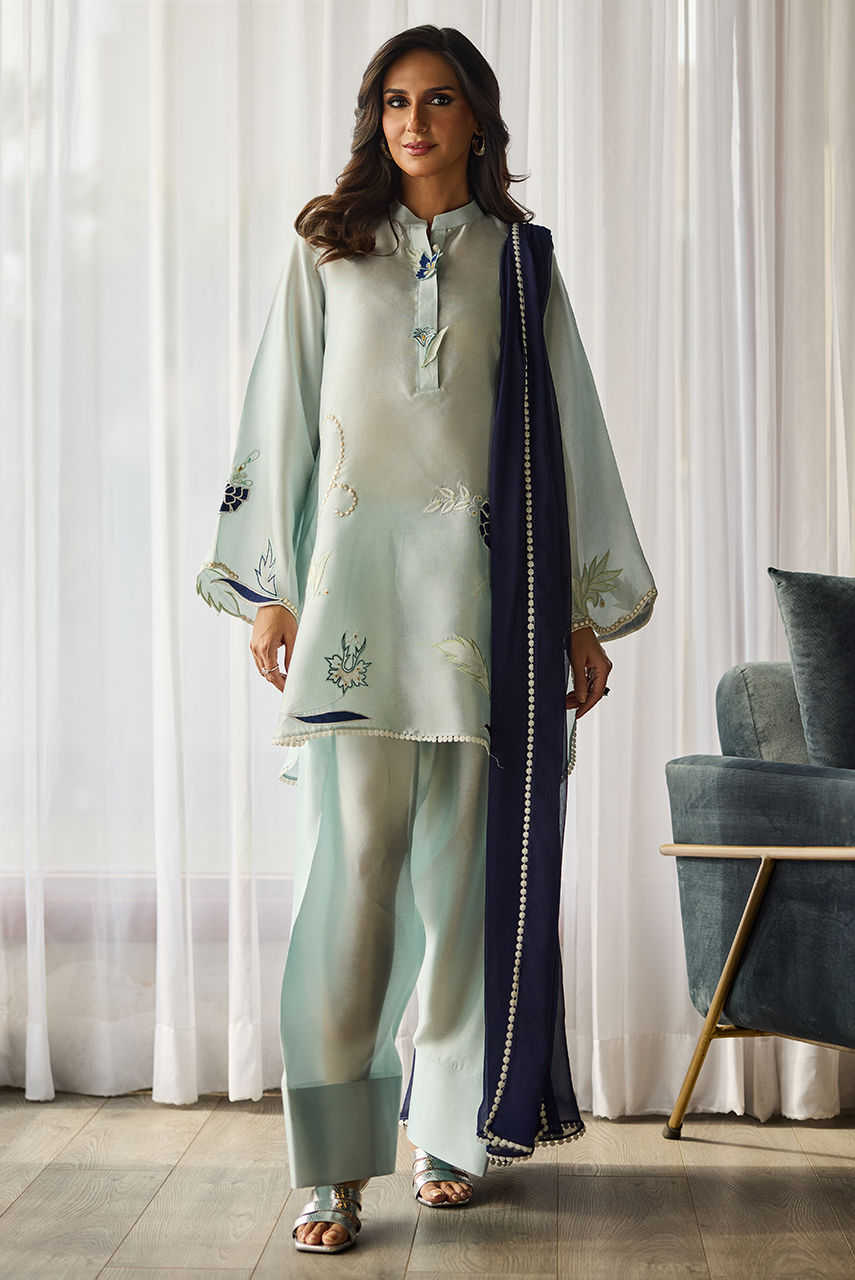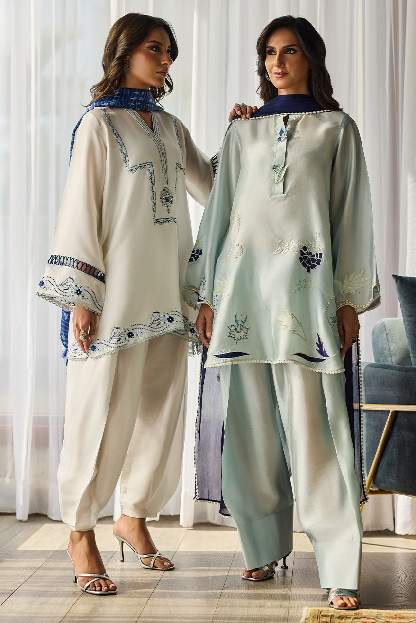 A silk shirt paired with farshi shalwar and chiffon dupatta finished with lace. It features A delicate floral embroidery combining intricate cutwork with soft appliqué detailing. The cutwork creates airy, open patterns, while the appliqué adds depth and dimensionality to each blossom and leaf. This fusion of techniques results in a modern and striking style