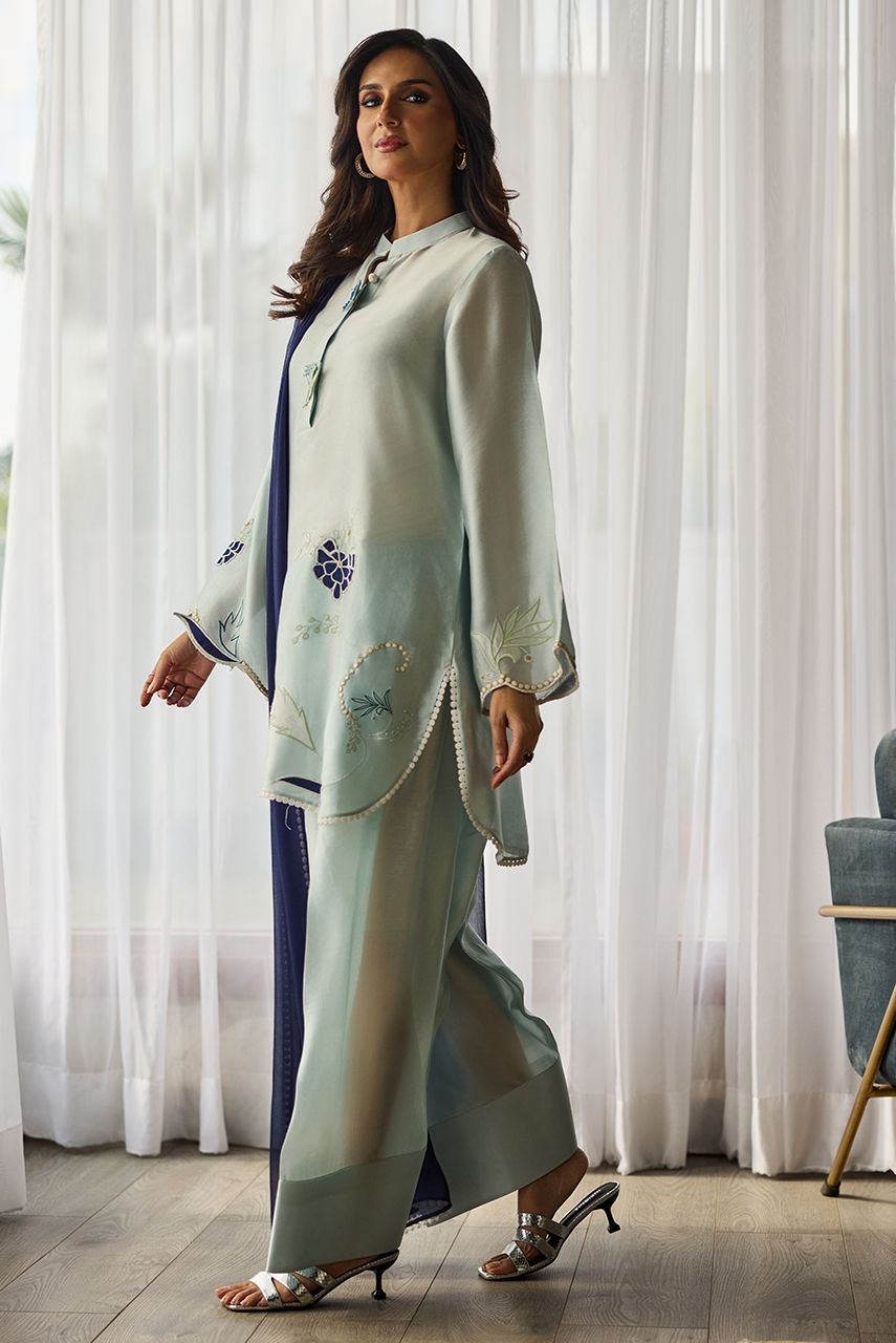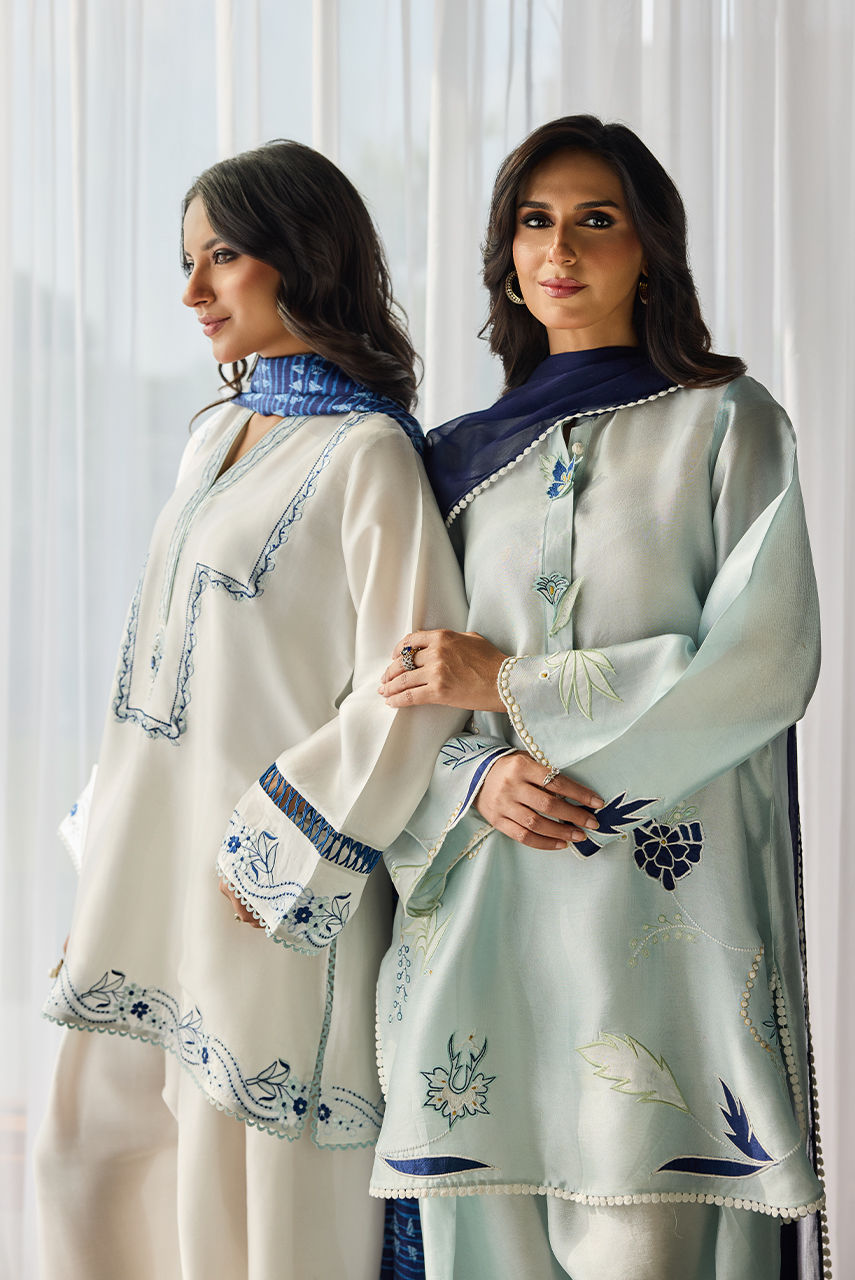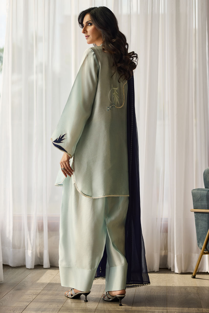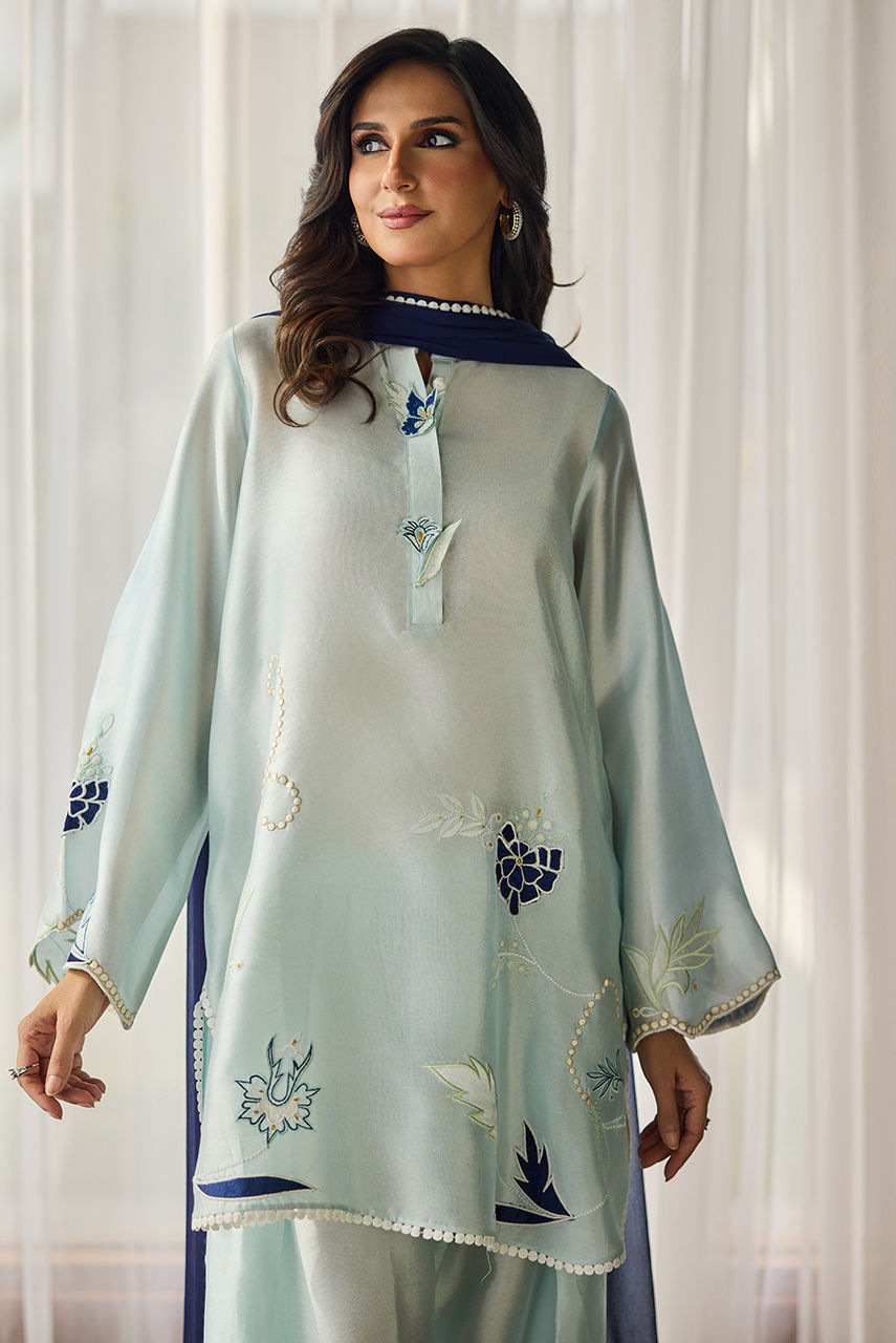A silk shirt paired with farshi shalwar and chiffon dupatta finished with lace. It features A delicate floral embroidery combining intricate cutwork with soft appliqué detailing. The cutwork creates airy, open patterns, while the appliqué adds depth and dimensionality to each blossom and leaf. This fusion of techniques results in a modern and striking style